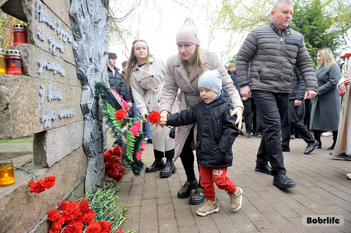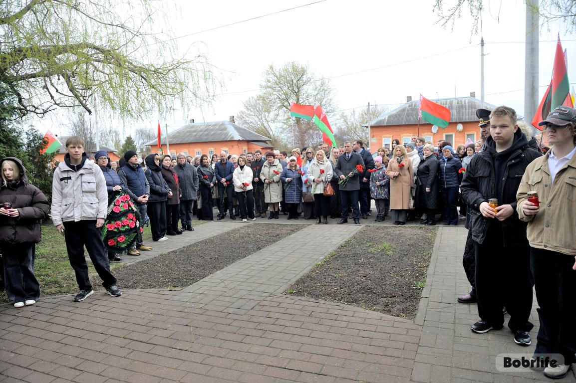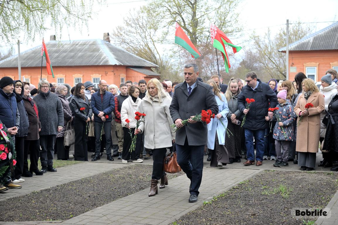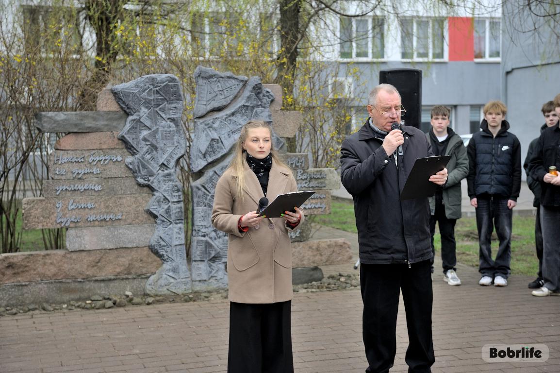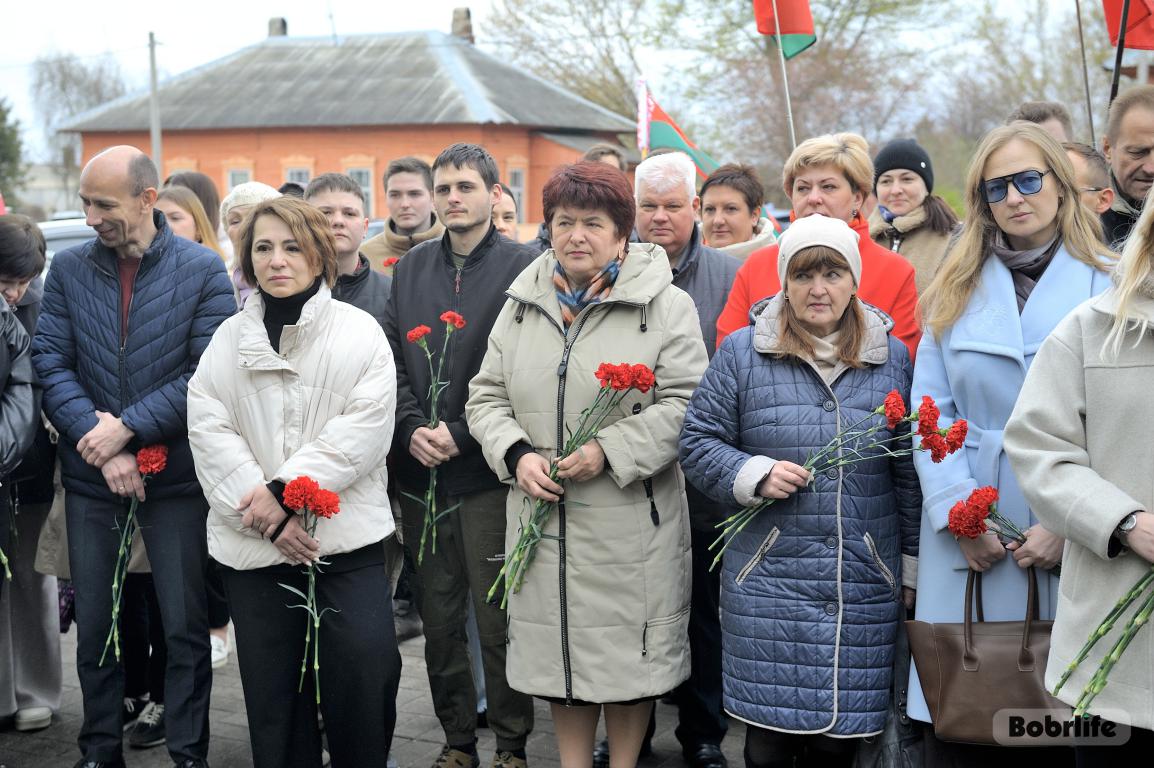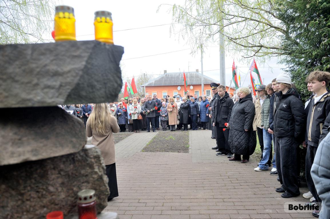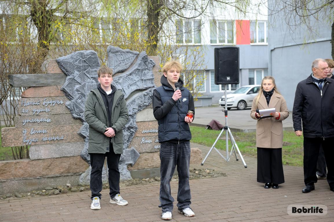 События Великой Отечественной войны стали страшной страницей истории нашего города. Каратели организовали на территории Бобруйской крепости лагерь смерти № 131, устроили в городе гетто, куда согнали все еврейское население Бобруйска, впоследствии зверски уничтоженное в 1941 году возле деревень Каменка и Еловики. В знак глубокой скорби и вечной памяти о безвинно погибших людях, в Международный день освобождения узников фашистских концлагерей неравнодушная молодежь и трудовые коллективы предприятий и организаций нашего города возложили цветы к мемориальному знаку «Узникам Бобруйского гетто». Разделили скорбь с горожанами глава администрации Первомайского района Виталий Власевич, заведующий сектором идеологической работы и по делам молодежи администрации Первомайского района Марта Чичерина, первый секретарь Первомайского РК ОО «БРСМ» Елена Евладова.