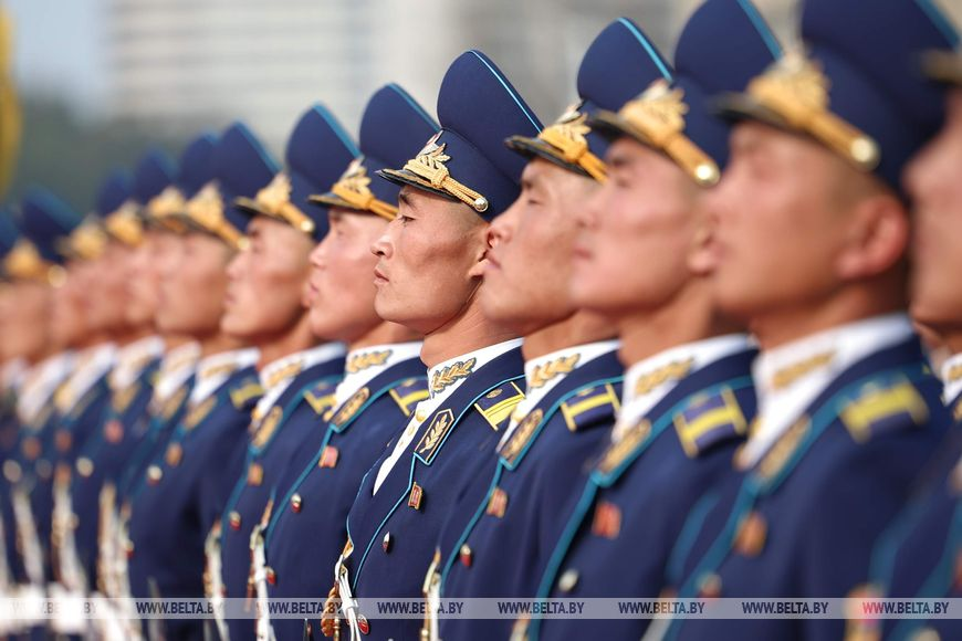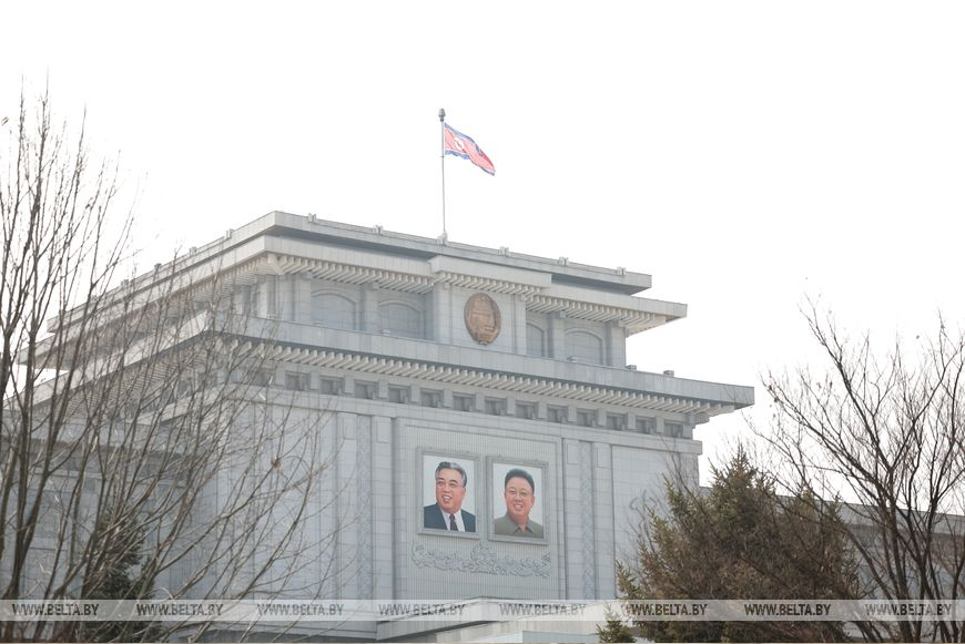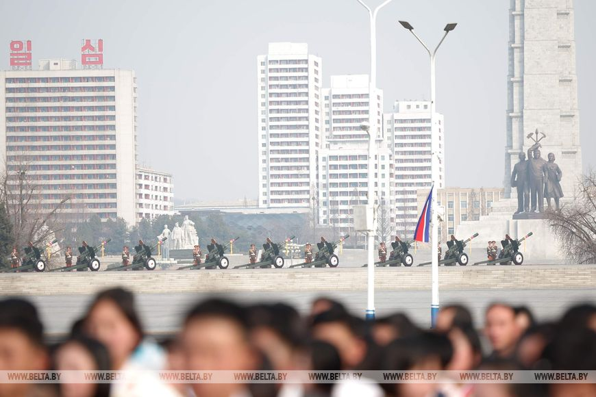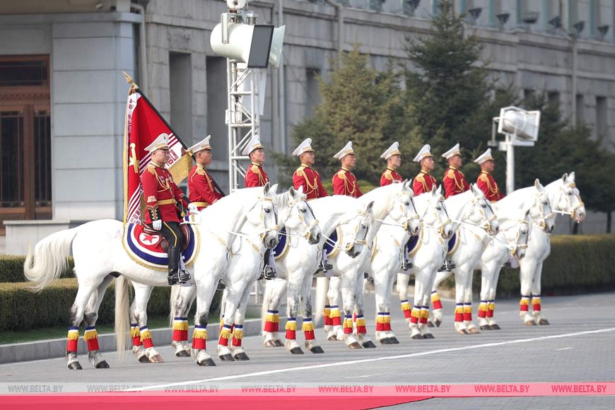 Церемония официальной встречи Президента Беларуси Александра Лукашенко Председателем Государственных дел Корейской Народно-Демократической Республики Ким Чен Ыном прошла в Пхеньяне, передает корреспондент БЕЛТА.