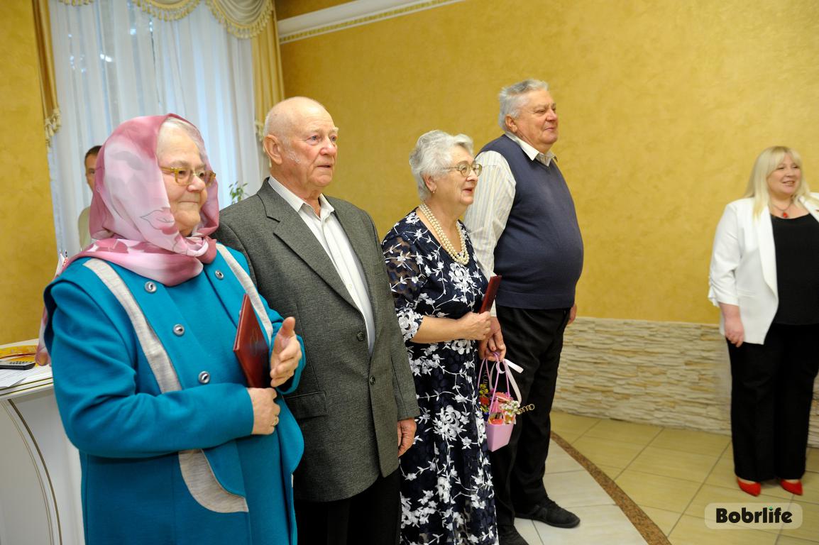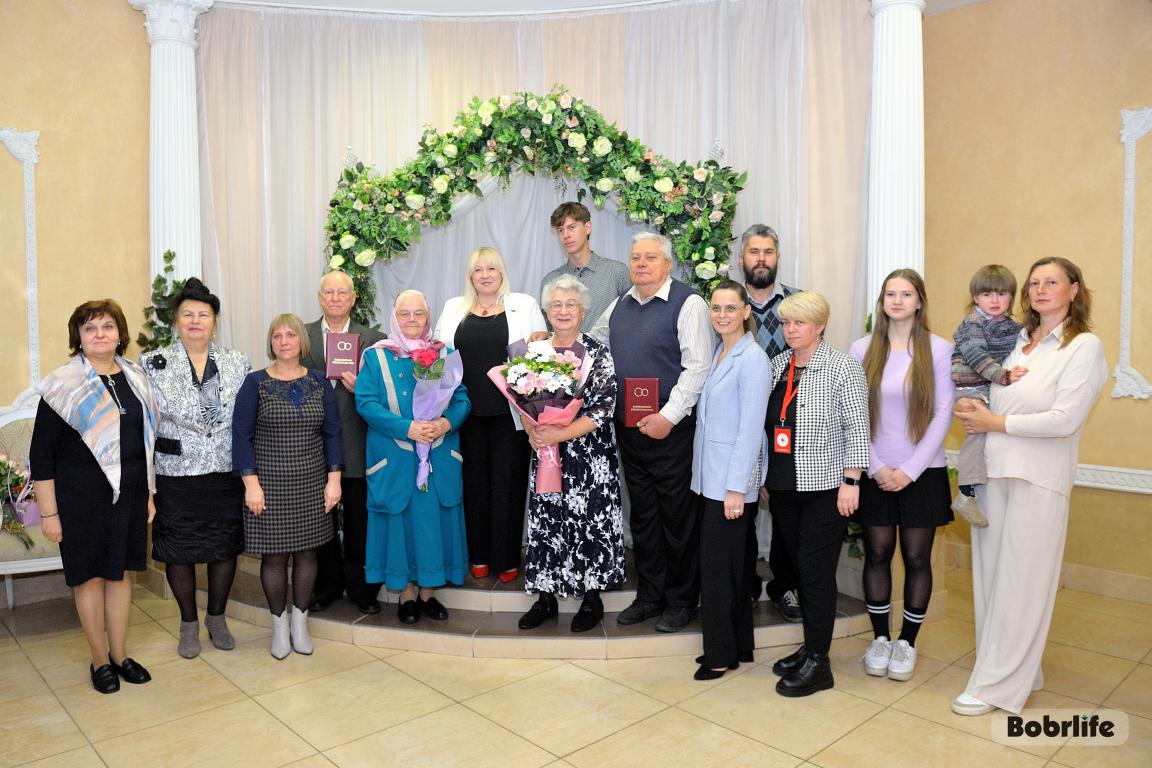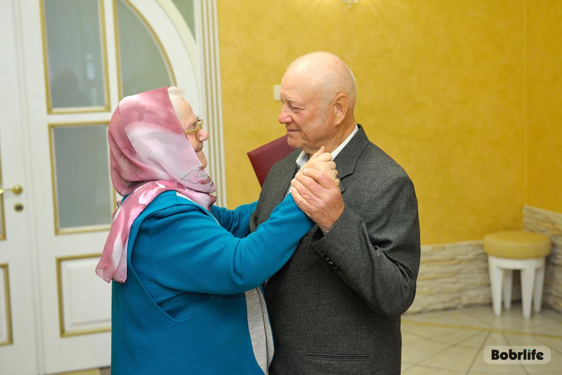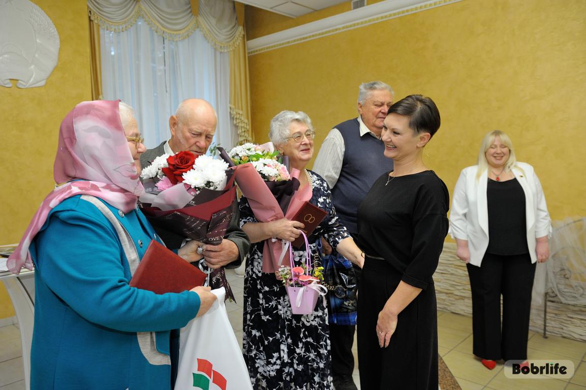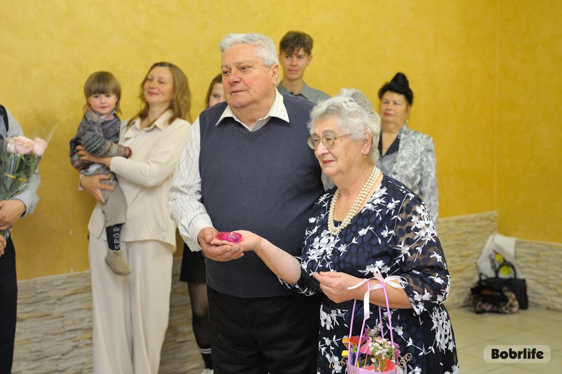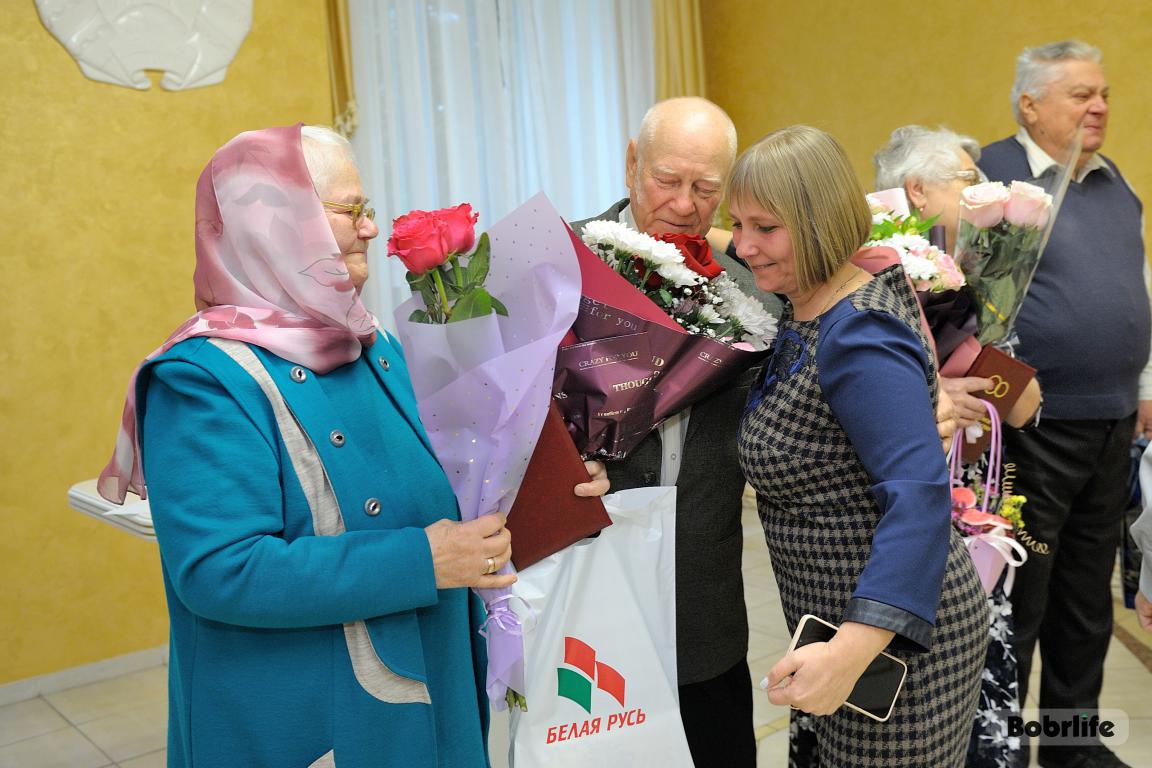 Представители Ленинского и Первомайского ТЦСОН, Ленинской районной организации г. Бобруйска РОО «Белорусское общество Красного Креста», а также Первомайской районной организации Бобруйска РОО «Белая Русь» поздравили юбиляров с важными датами, пожелав им крепкого здоровья, благополучия и долгих лет счастливой семейной жизни. Трогательными моментами церемонии стали зажжение свечи, супружеский поцелуй и свадебный вальс. И кульминация торжества – подписи в Книге почетных юбиляров, где супруги увековечили свои имена и историю любви для будущих поколений.