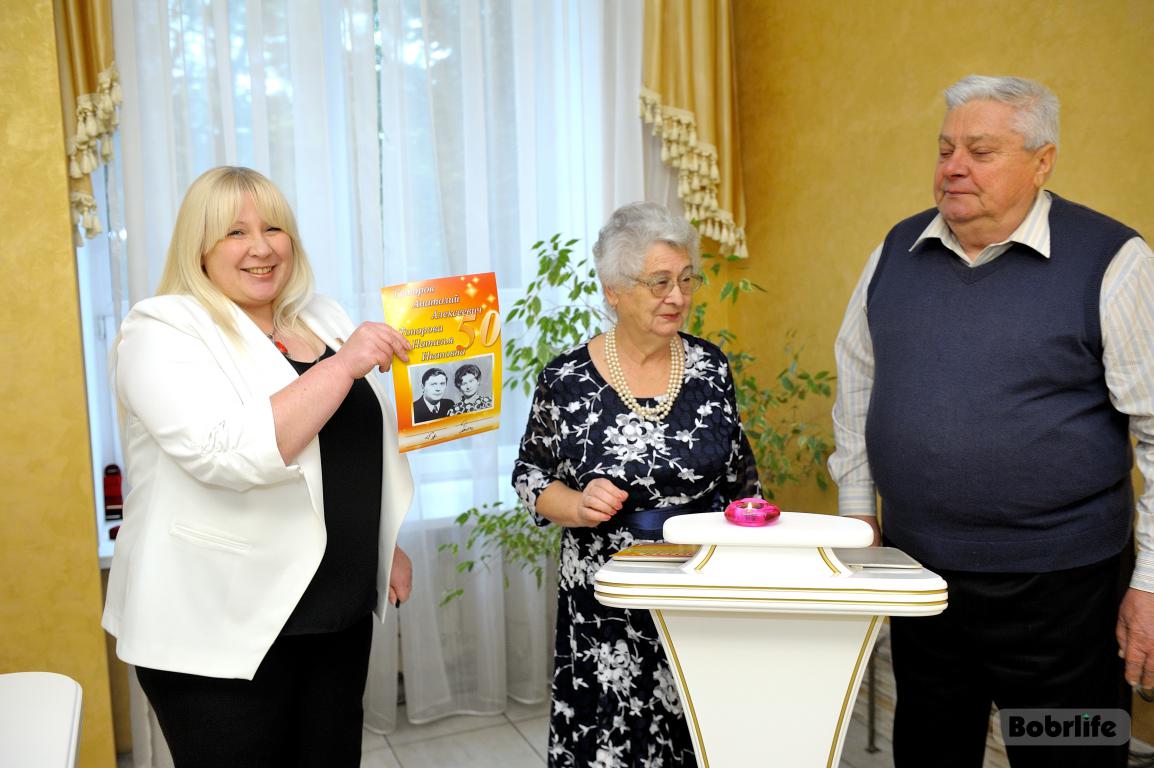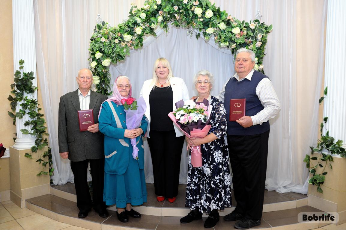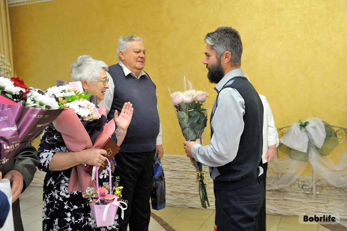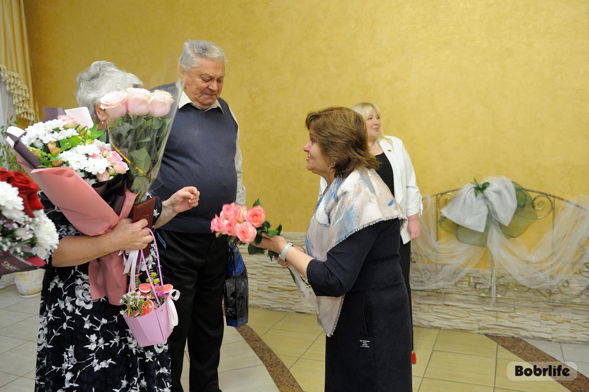 Семейная пара – Анатолий Васильевич Гуторов и Наталья Ивановна Топорова пришли на торжественную регистрацию золотой свадьбы, а супруги Михаил Степанович и Софья Федоровна Руденок – изумрудной: вместе они 55 лет. Зал был наполнен трогательными воспоминаниями и улыбками. Пары, прожившие вместе долгие годы, делились секретами семейного счастья, вспоминали истории знакомства, свадебные торжества и самые яркие моменты совместной жизни.