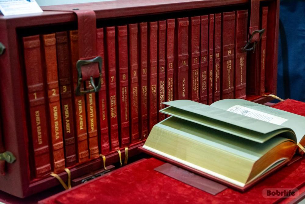 После выступлений и знакового перерезания ленты – экскурсия по выставочному залу. Отдельно почетные гости остановились у стенда Могилевской области, посвященному женщинам-героям социалистического труда Приднепровского края. Вниманию зрителей – исторические факты, творения современников и главная книга стенда –«Гордость и Слава Могилевщины».