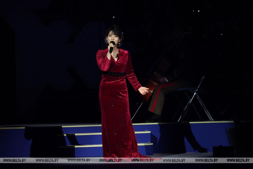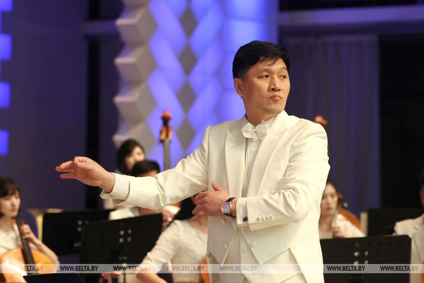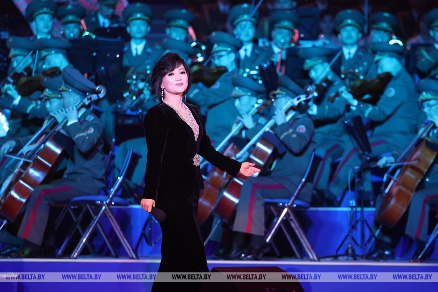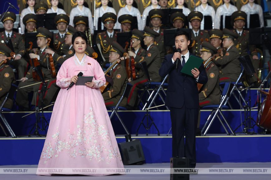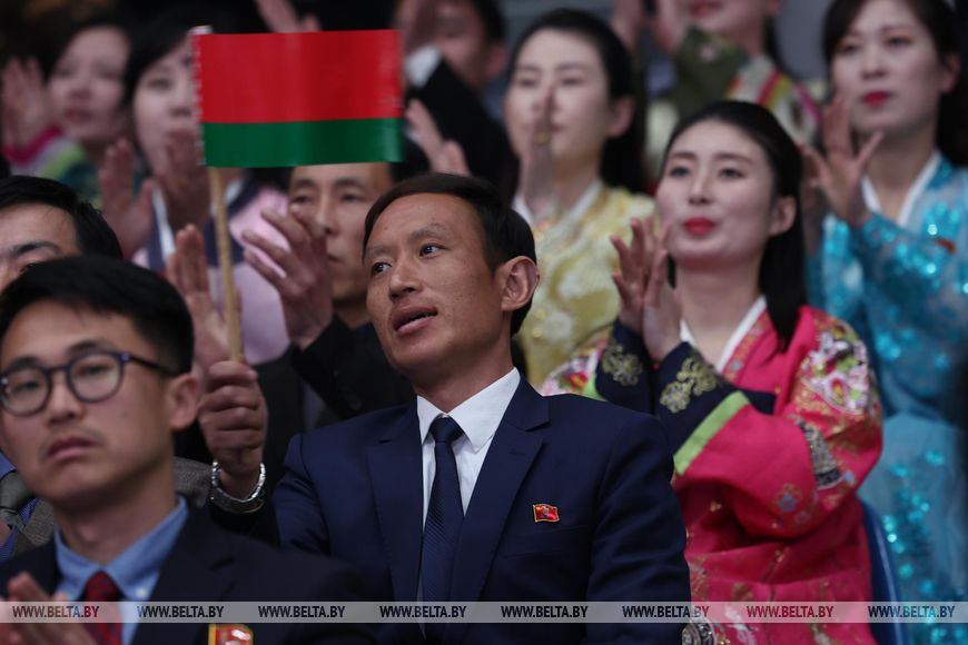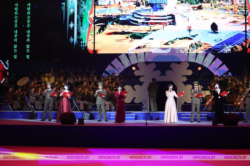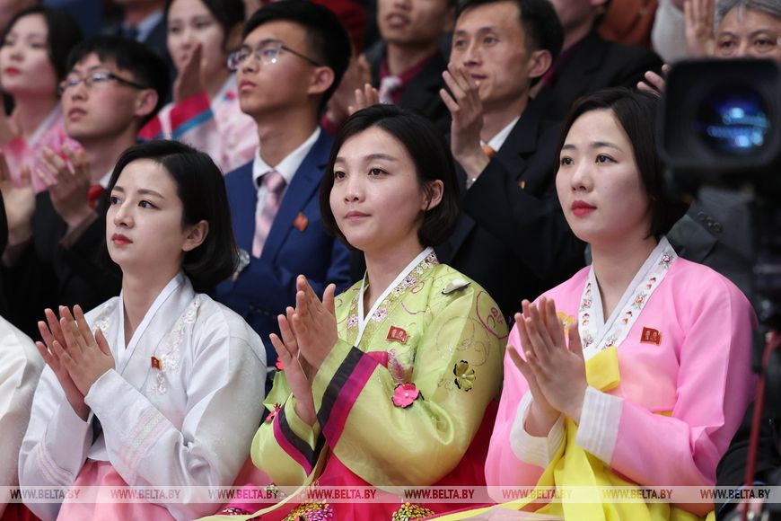 Александр Лукашенко вместе с Ким Чен Ыном посетил приуроченный к визиту торжественный концерт, на котором корейские артисты исполнили как национальные произведения, так и известные белорусские песни.