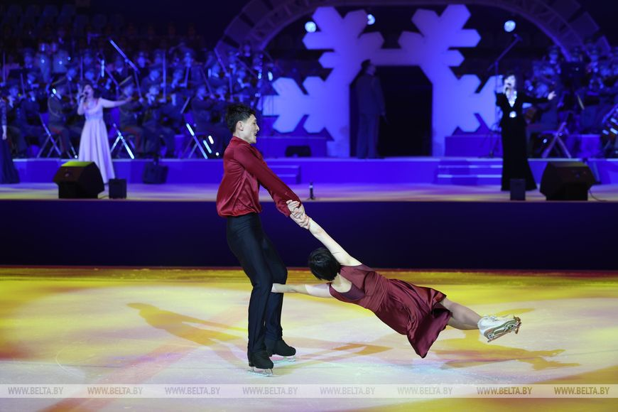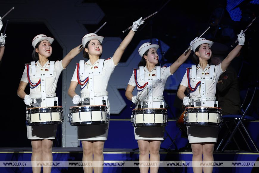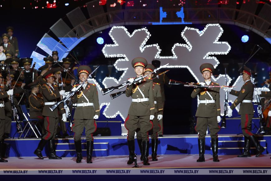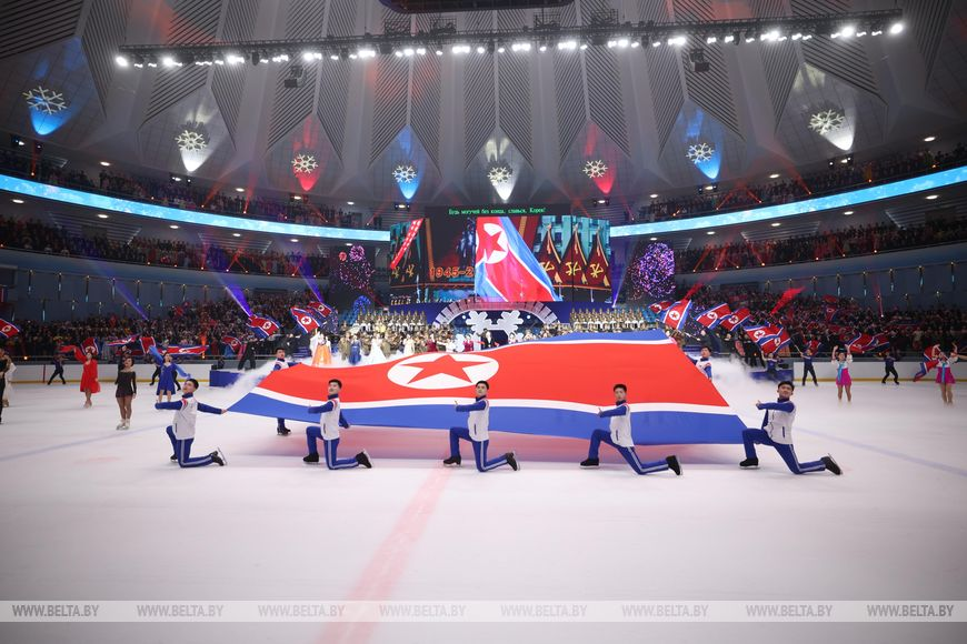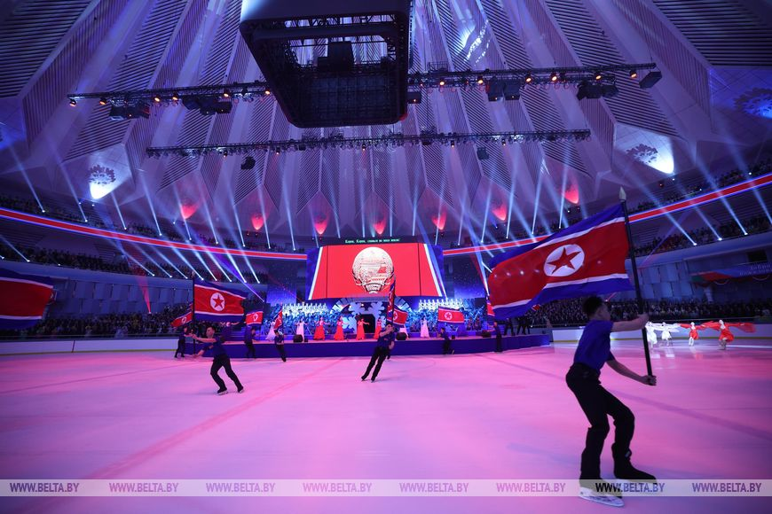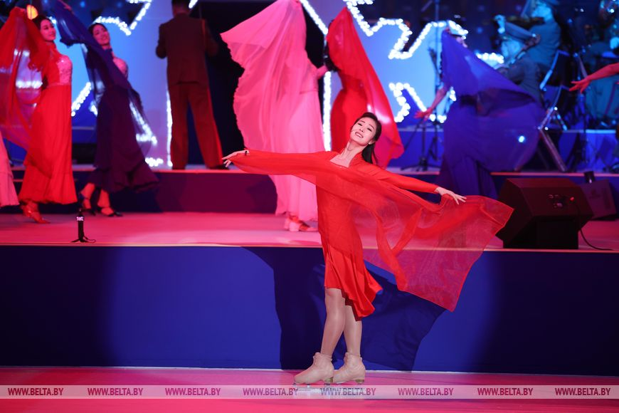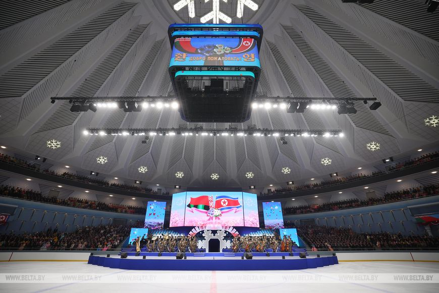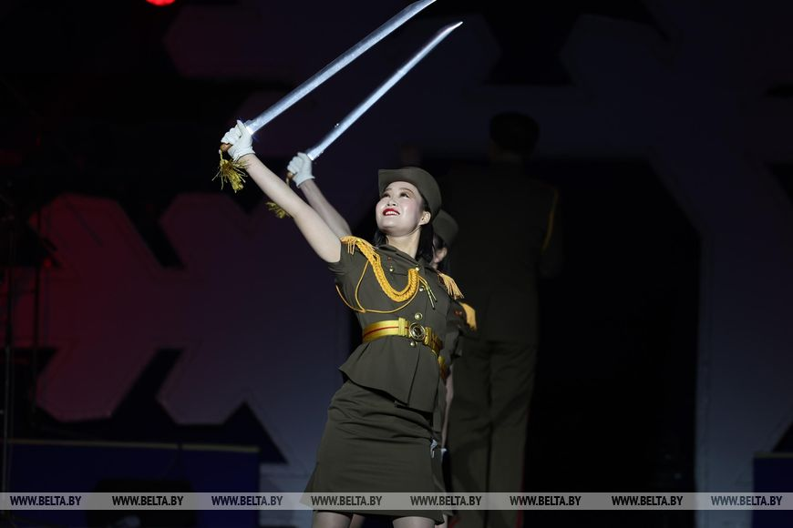 Александр Лукашенко вместе с Ким Чен Ыном посетил приуроченный к визиту торжественный концерт, на котором корейские артисты исполнили как национальные произведения, так и известные белорусские песни.