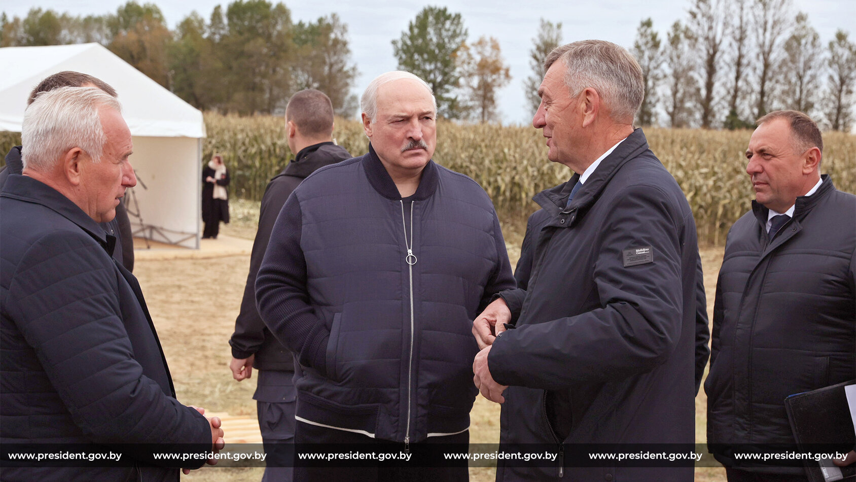 Следующая точка маршрута — кукурузное поле. И здесь уже от локального — к глобальному. К разговору подключаются министр сельского хозяйства и продовольствия Юрий Горлов и губернатор Могилевской области Анатолий Исаченко. Президенту подробно доложили об осенних полевых работах в районе, области и стране в целом.