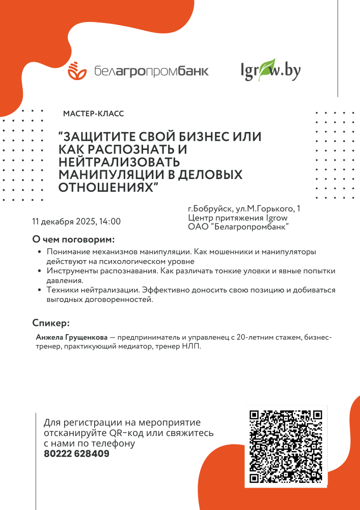 11 декабря в 14.00 в центре притяжения Igrow по адресу М.Горького, 1 состоится мастер-класс «Защитите свой бизнес или как распознать и нейтрализовать манипуляции в деловых отношениях».