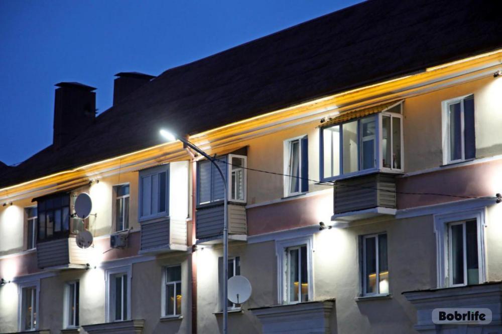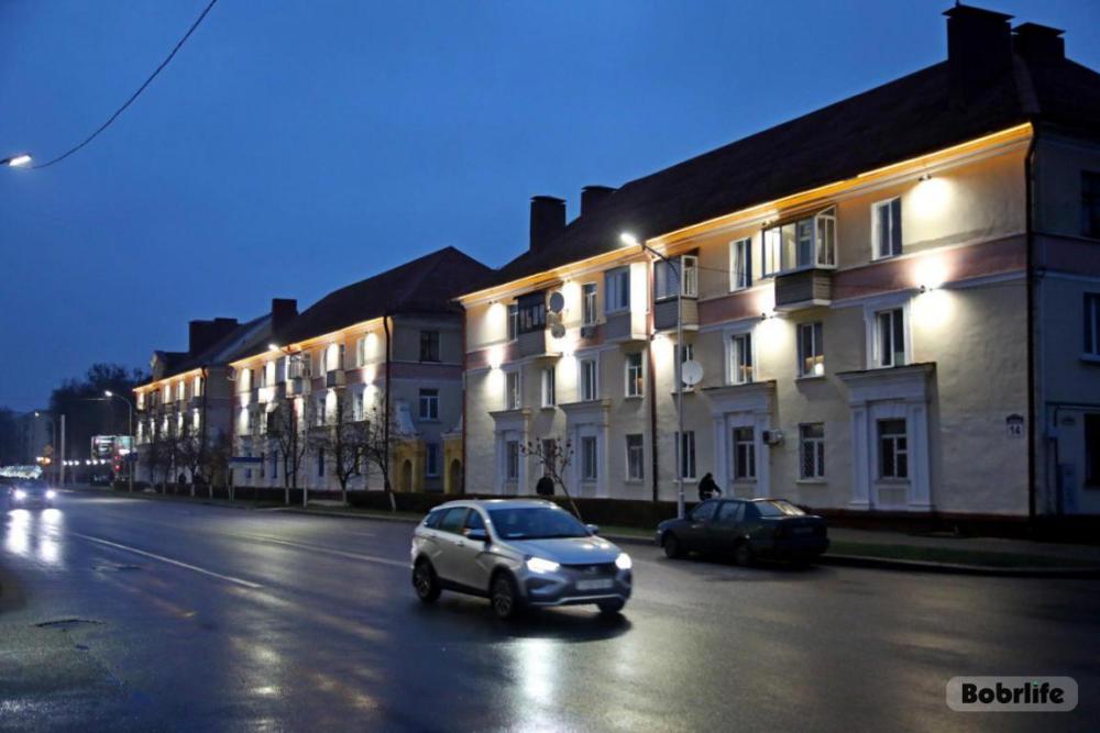 На улице Минской, 14 в Бобруйске засияла новая архитектурная подсветка, преобразившая фасад седьмого по счету жилого дома в настоящее произведение искусства.