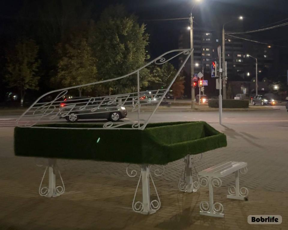 Исполнитель новой локации «Бобруйскагромаш». Место уже стало центром притяжения горожан. Верх музыкального инструмента выполнен из искусственного материала. Крышка рояля - нотный стан.