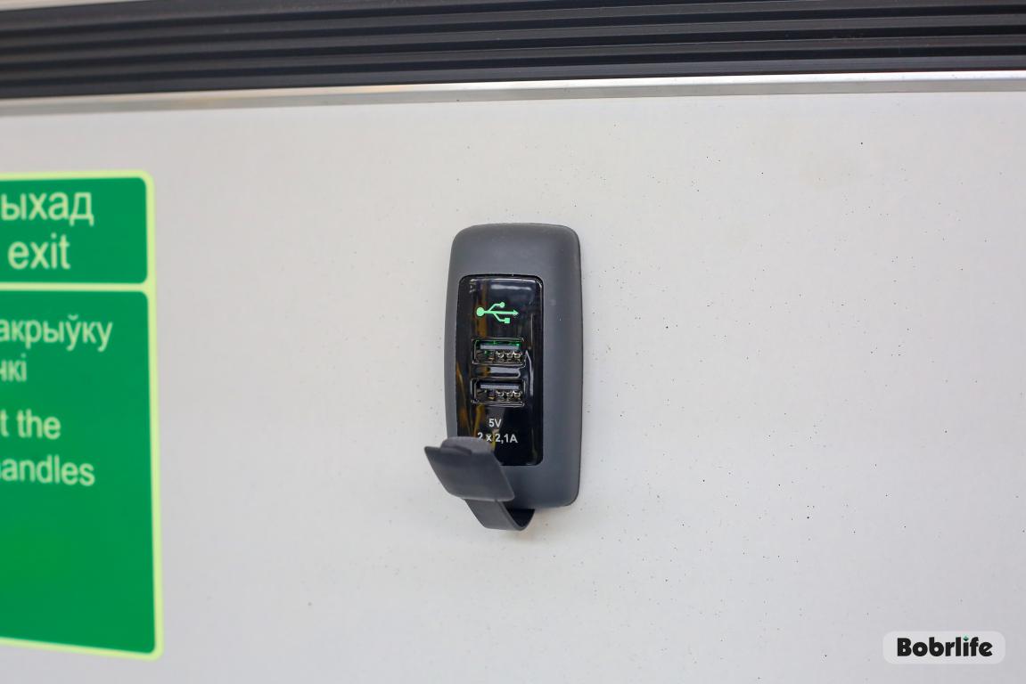 Для удобства пассажиров троллейбусы оборудованы яркой подсветкой (красный цвет – проход запрещен, белый – разрешен), камерами видеонаблюдения, кондиционерами, зарядками для мобильных телефонов, пандусом для людей с ограниченными возможностями, специальными местами для инвалидов-колясочников, для колясок с детьми, а также для слабовидящих граждан с собакой-поводырем. Оплатить проезд можно картой – в поручень встроен специальный блок. Позаботились и о комфорте водителя, внутри кабины установлен мультируль, регулируемое сиденье, система климат-контроля и навигатор с маршрутом.
