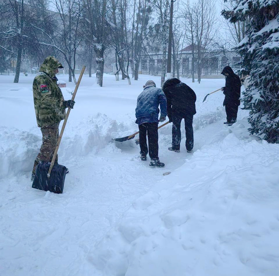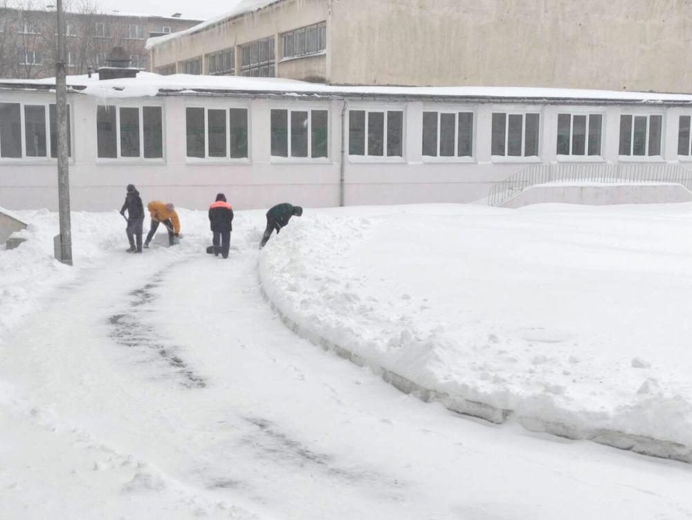 Работники колледжа им. Ларина за пару часов превратили заснеженный двор в аккуратную территорию.