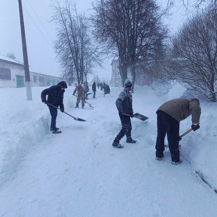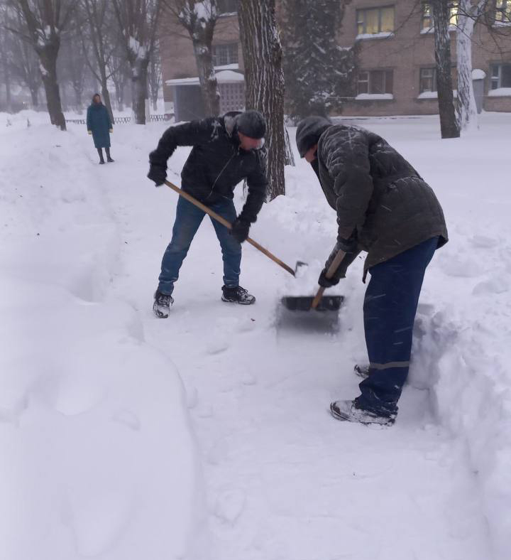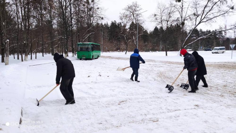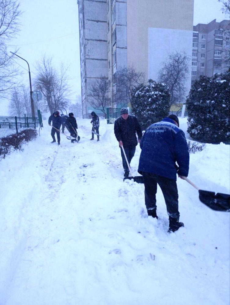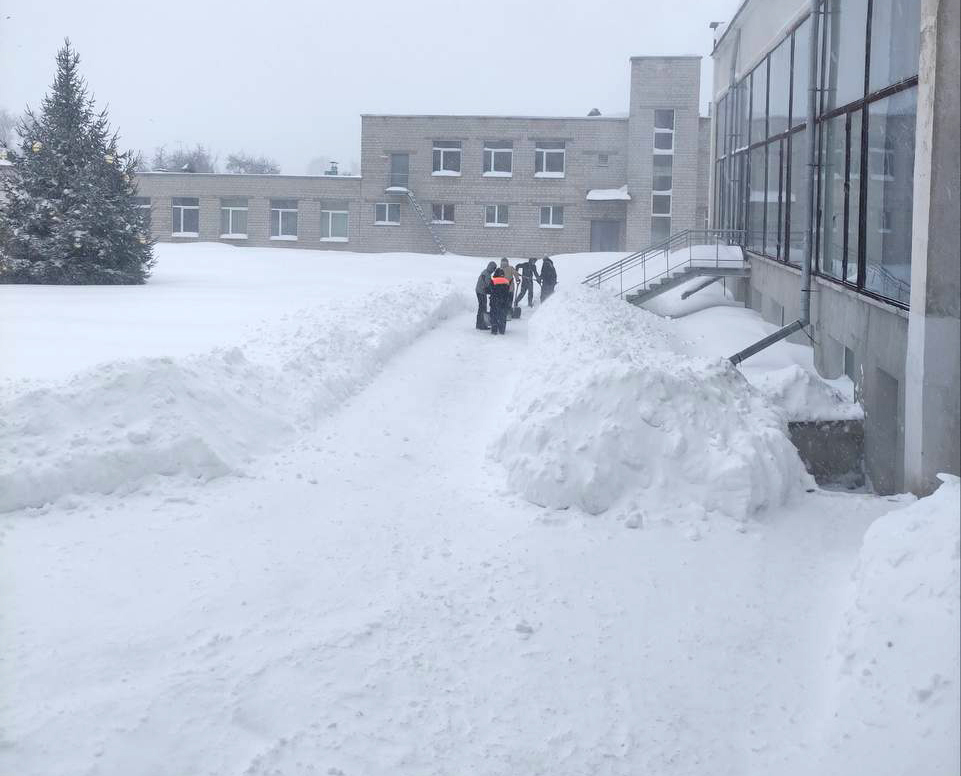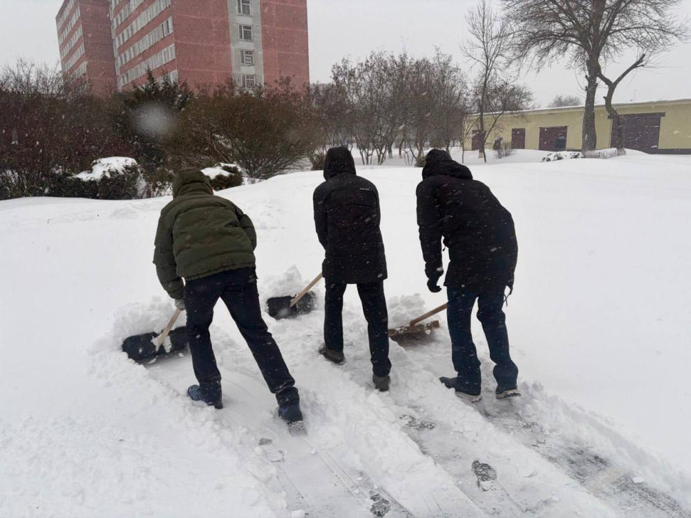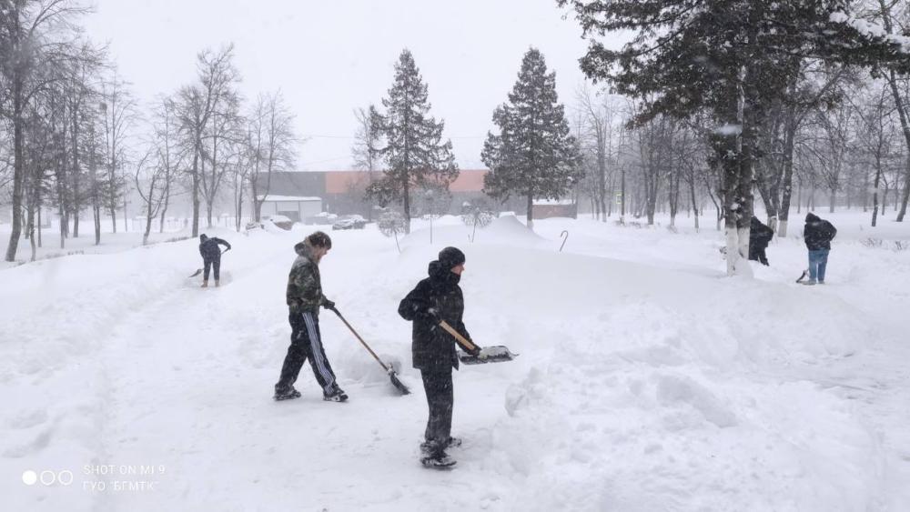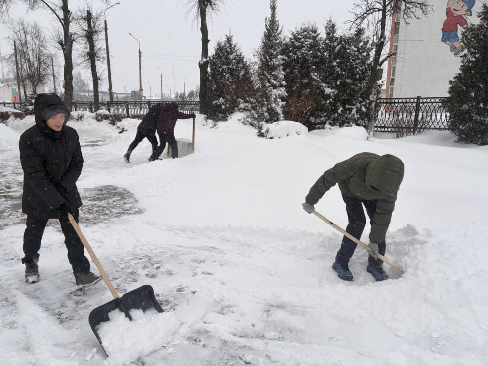 После сильнейшего снегопада коллектив механико-технологического колледжа дружно вышел на уборку территории.