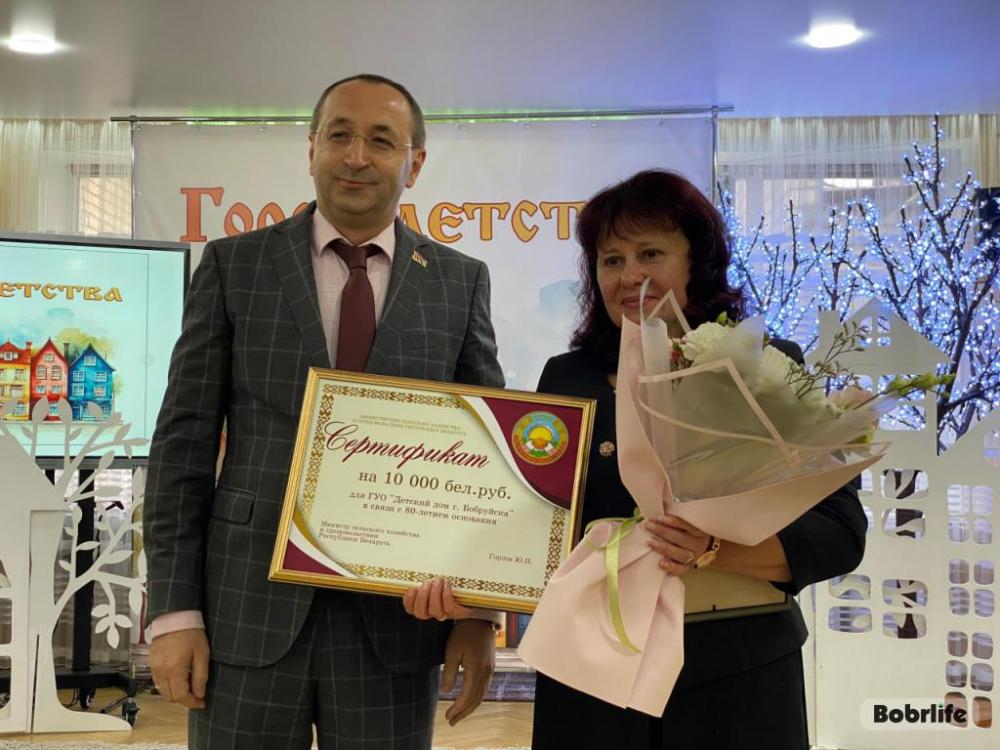 Вручив директору детского дома Марине Шарко приветственный адрес от Министерства сельского хозяйства и продовольствия, а ряду работников почетные грамоты, Александр Яковчиц поблагодарил коллектив за огромный труд и любовь к воспитанникам. Отметил, что затраченное на детей время и наполненные любовью сердца — самое ценное, что можно дать маленькому человеку.