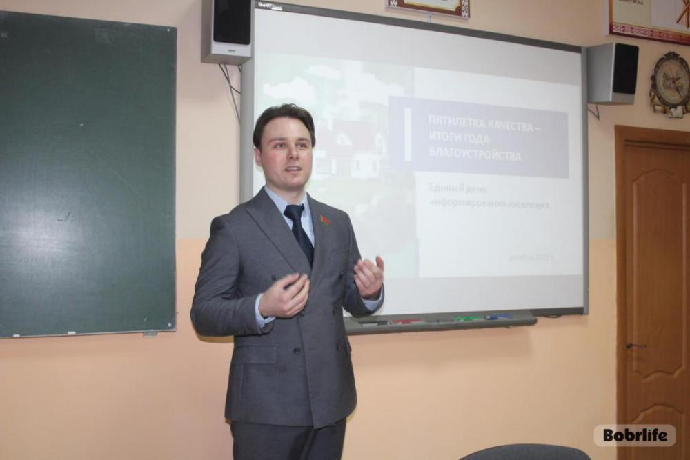 Бобруйский государственный торгово-экономический колледж в этот день посетил член Белорусского общества «Знание» Дмитрий Батюня. На встрече с коллективом – педагогическими работниками и учащимися – Дмитрий Андреевич подытожил результаты Года благоустройства. В городе на Березине, как он отметил, работа проведена масштабная. Это обновленный жилой фонд, ремонт и обустройство дорог, установка современных светофоров, возведение нового корпуса городской больницы, установка спортивных, детских игровых площадок и многое другое. В масштабах страны это, в том числе, введение в хозяйственный оборот огромных площадей земли.
