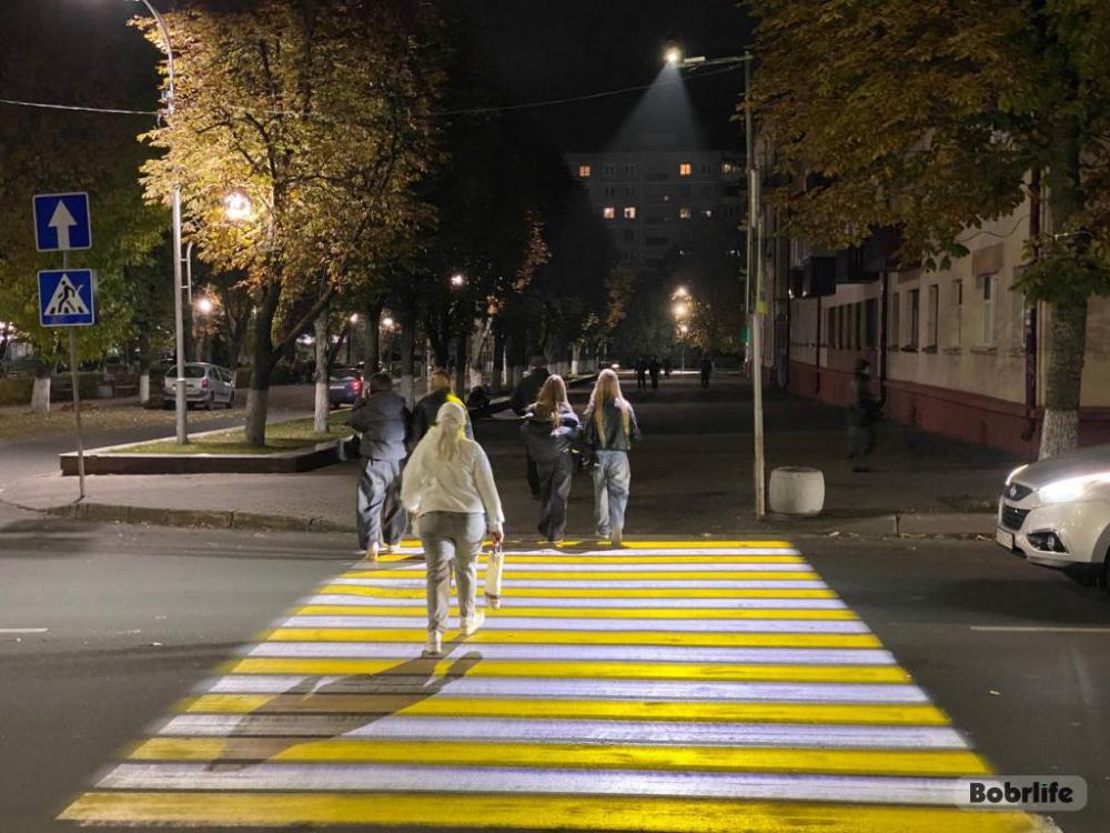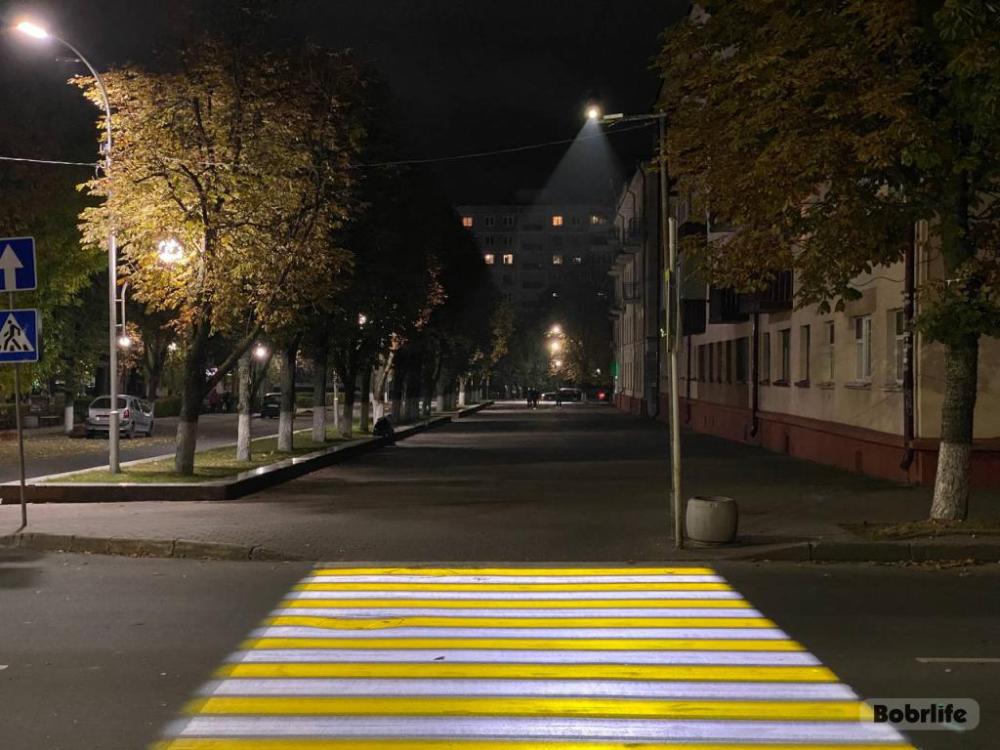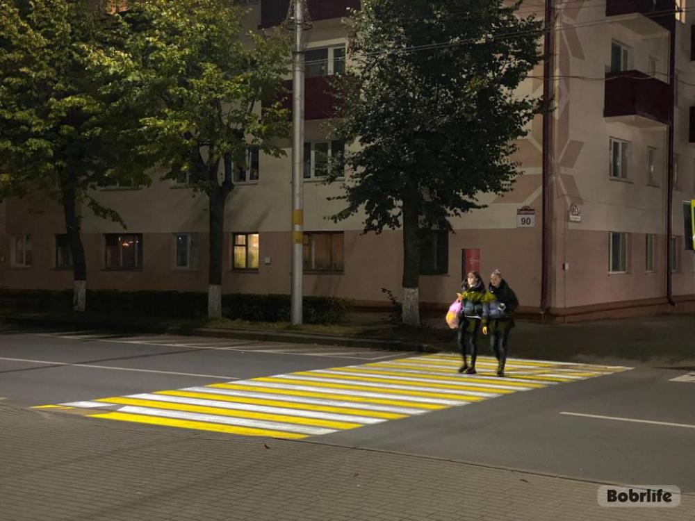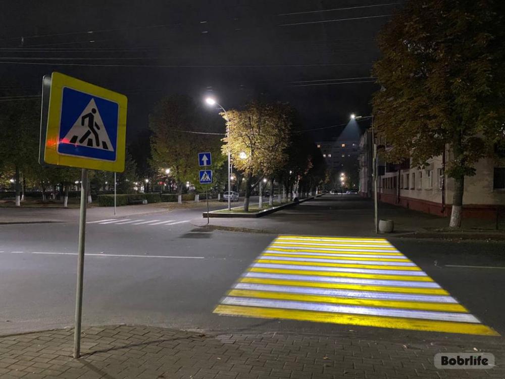 В Бобруйске появилась проекционная разметка. Она расположилась на пересечении улиц Советской и Максима Горького с двух сторон от автобусной остановки.