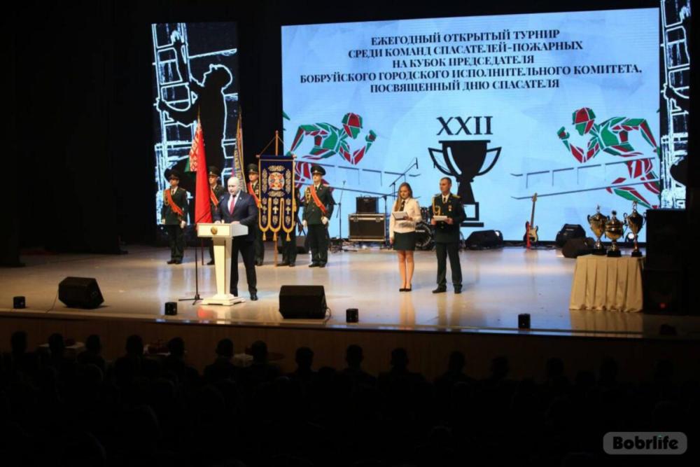 Во Дворце искусств состоялось торжественное открытие XXII открытого турнира по мини-футболу, волейболу и пожарному спорту на Кубок председателя Бобруйского горисполкома среди подразделений пожарных-спасателей. Мероприятие традиционно посвящено профессиональному празднику – Дню спасателя. В церемонии принимали участие председатель Бобруйского горисполкома Максим Гурин, председатель Бобруйского горсовета депутатов Ирина Рынейская, председатель Бобруйского райисполкома Михаил Крицкий, заместитель начальника Могилевского областного управления МЧС Дмитрий Исаченко, представители администраций районов Бобруйска, предприятий, духовенства, почетные гости из Российской Федерации. Участников турнира – команды из Беларуси и России (Наро-Фоминска, Калининградской области) – гостеприимно встретили хлебом-солью, вручив караваи.