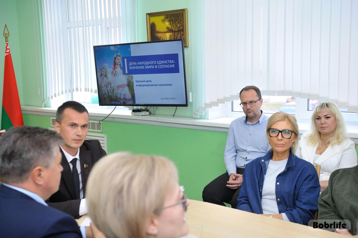 Сплоченность общества, стремление к миру и благополучию, взаимному уважению близки всем, кто с любовью и заботой относится к своей стране. «День народного единства: значение мира и согласия» – главная тема сентябрьского Единого дня информирования. О ценностях, которые отражаются в единстве нашего народа, об основе для успешного развития Беларуси говорили 18 сентября на встрече с трудовым коллективом КУП «ДЭП г. Бобруйска». С работниками предприятия пообщался первый заместитель председателя горисполкома Максим Стукалов.