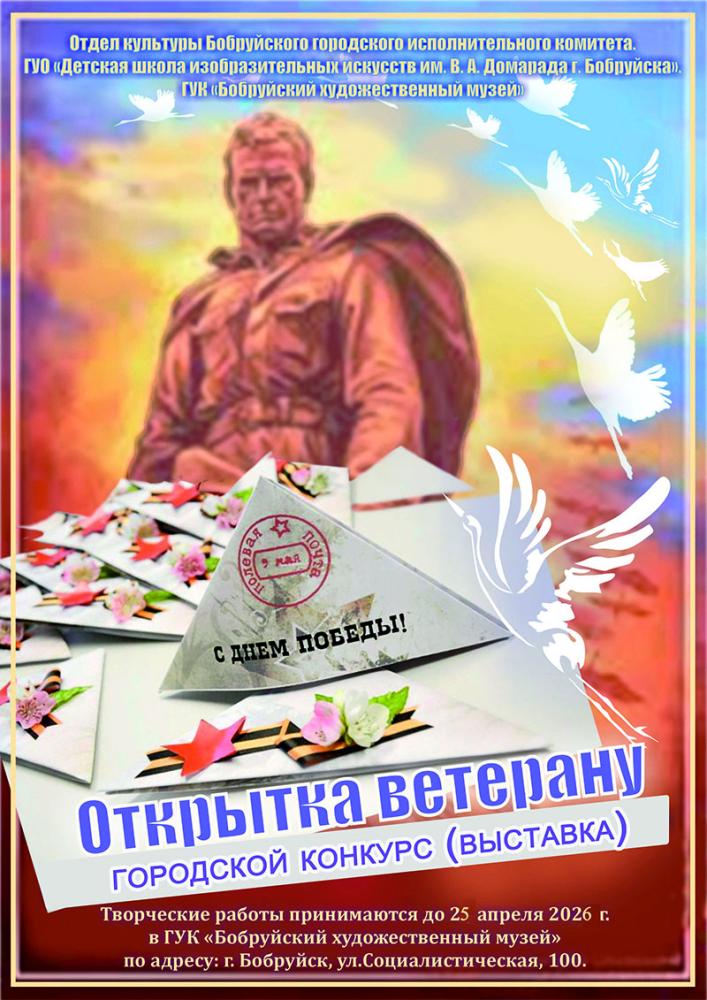 Бобруйчан приглашают к участию в городском конкурсе «Открытка ветерану»! Творческие работы принимаются до 25 апреля в ГУК «Бобруйский художественный музей», по адресу: г. Бобруйск, ул. Социалистическая, д.100.
