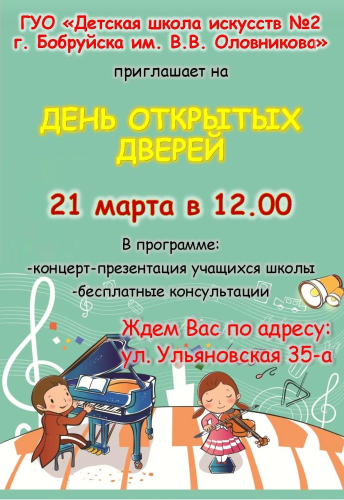 Уважаемые родители! Мы рады пригласить вас и ваших детей на День открытых дверей в детскую школу искусств №2 имени В.В. Оловникова, который состоится 21 марта в 12.00.
