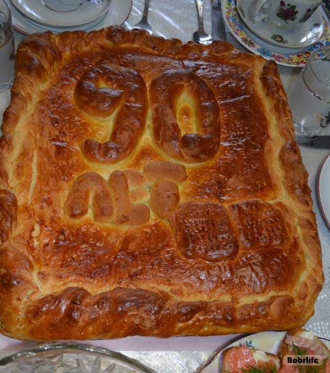 После череды поздравлений и подарков хозяева хлебосольно пригласили желающих отведать вкусный и красивый пирог с надписью «90», который испекла дочь именинника Елена.