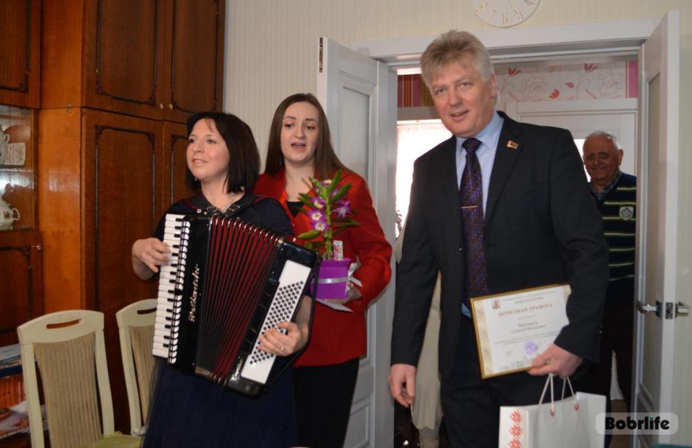Почетную грамоту отдела культуры за многолетний добросовестный труд и личный вклад в развитие культуры города вручил имениннику начальник отдела культуры горисполкома Вадим Щербич. Подарки юбиляр получил от депутата городского Совета, заместителя председателя Бобруйской городской организации Белорусского профсоюза работников культуры, информации, спорта и туризма Ирины Козловой, директора КУП «Бобруйсккино» Сергея Богдановича, председателя общественного объединения ветеранов комсомола Бобруйска и Бобруйского района Юрия Худякова и представителей администрации аграрно-экономического колледжа.