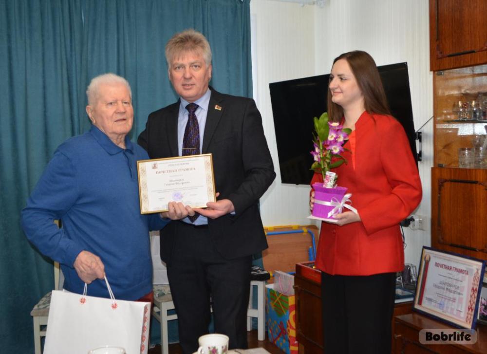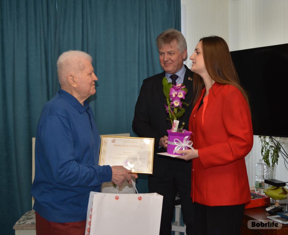 Поздравить юбиляра пришли председатель Бобруйской городской организации Белорусского общественного объединения ветеранов Наталья Коновалова, председатель Ленинской районной организации Бобруйска БООВ Нина Костян, ответственный секретарь БГО БООВ Светлана Бобко.