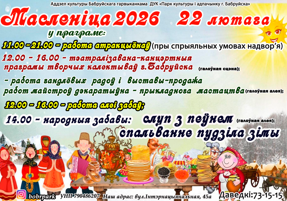 Масленица – один из самых ярких народных праздников, который длится целую неделю, с 16 по 22 февраля. Традиционным завершением станет концертная программа, насыщенная театрализованными номерами в исполнении творческих коллективов и песенными выступлениями. Место проведения – главная сцена парка культуры и отдыха, 22 февраля с 12.00 до 16.00.