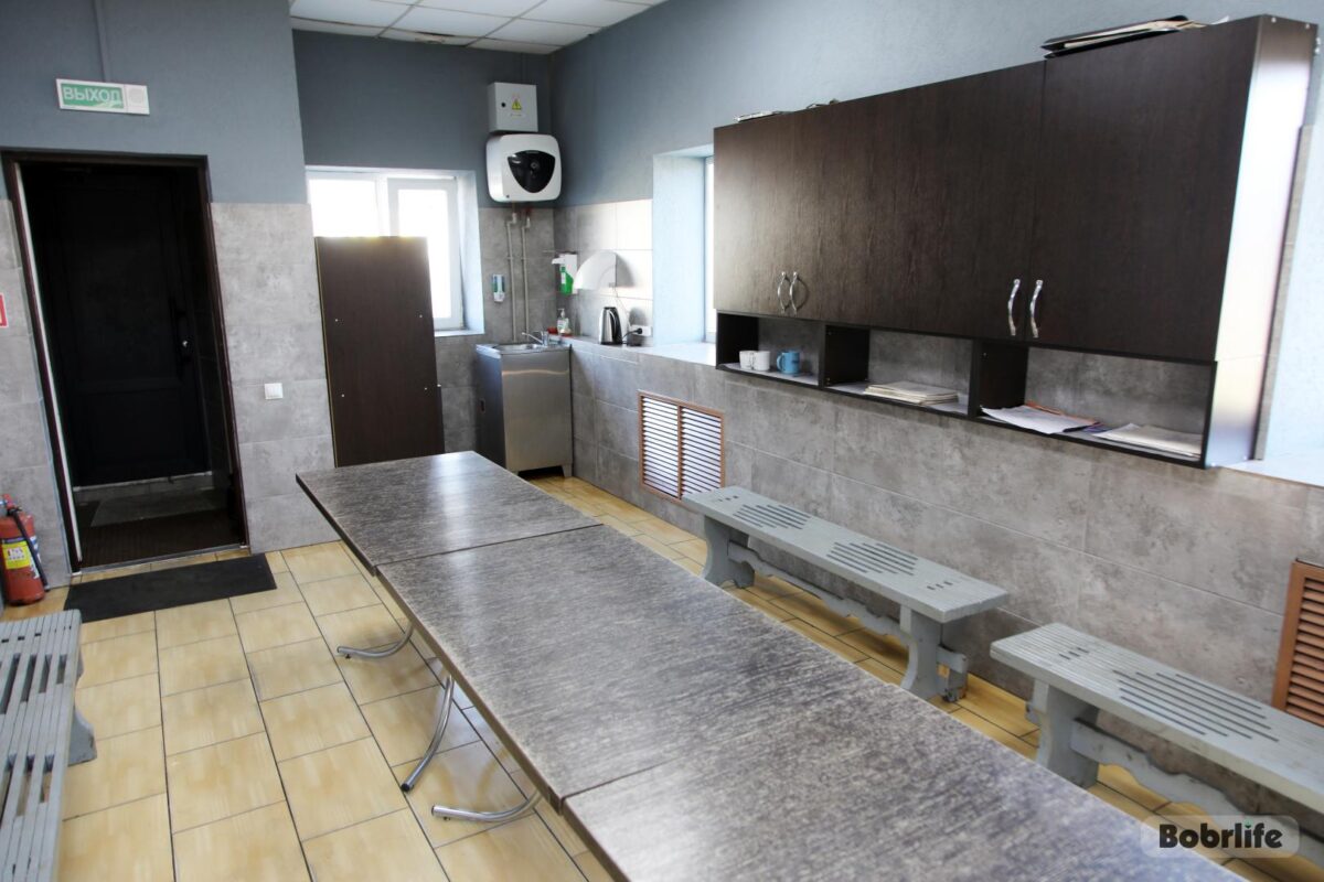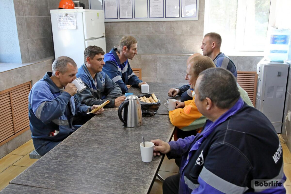 В коллективе Бобруйского цеха 60 человек с разными условиями труда, в том числе с вредными. Поэтому серьезно были улучшены и бытовые условия для работников: отремонтирован отапливаемый санузел, обновлена комната приема пищи. В помещении расположены кухонные шкафчики и столы, холодильник, микроволновки и даже специальный аппарат для холодной газированной воды. Здесь приятно выпить чашечку кофе, пообедать и пообщаться в свободные минуты.