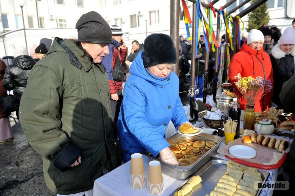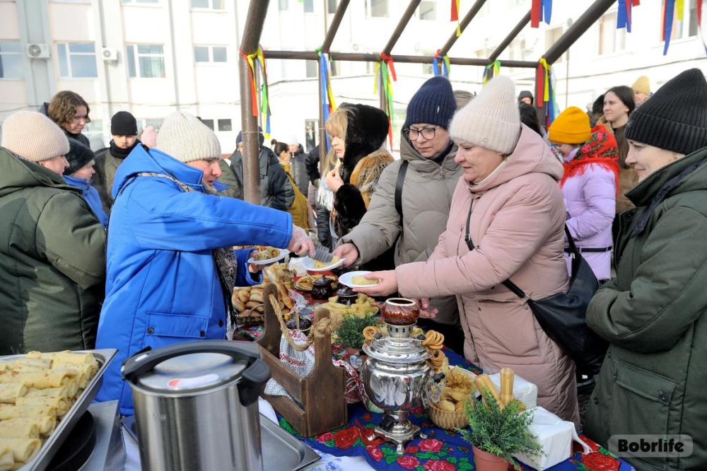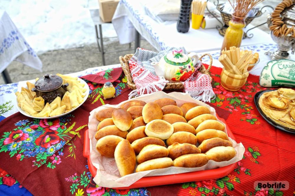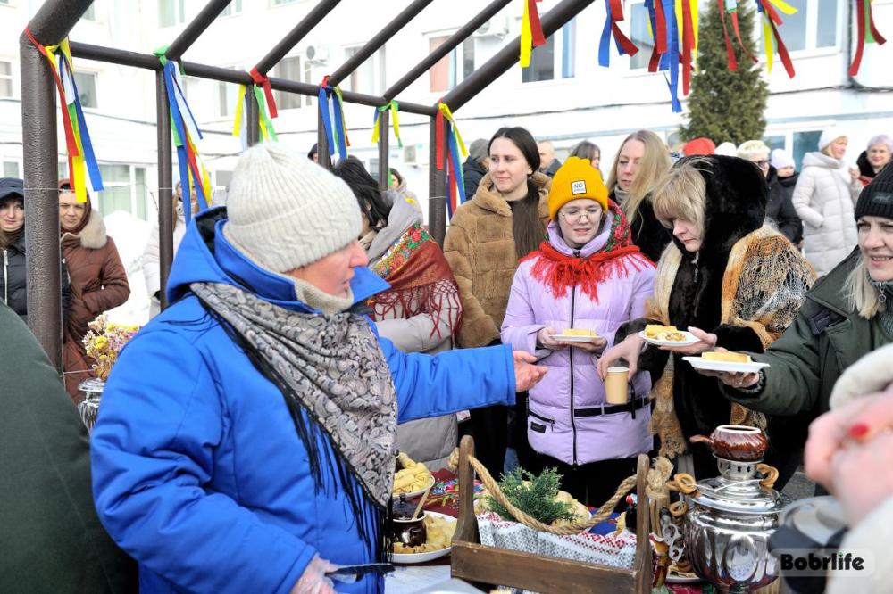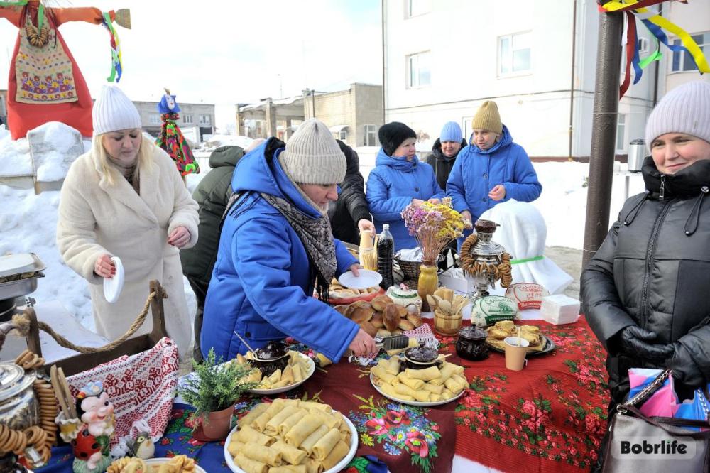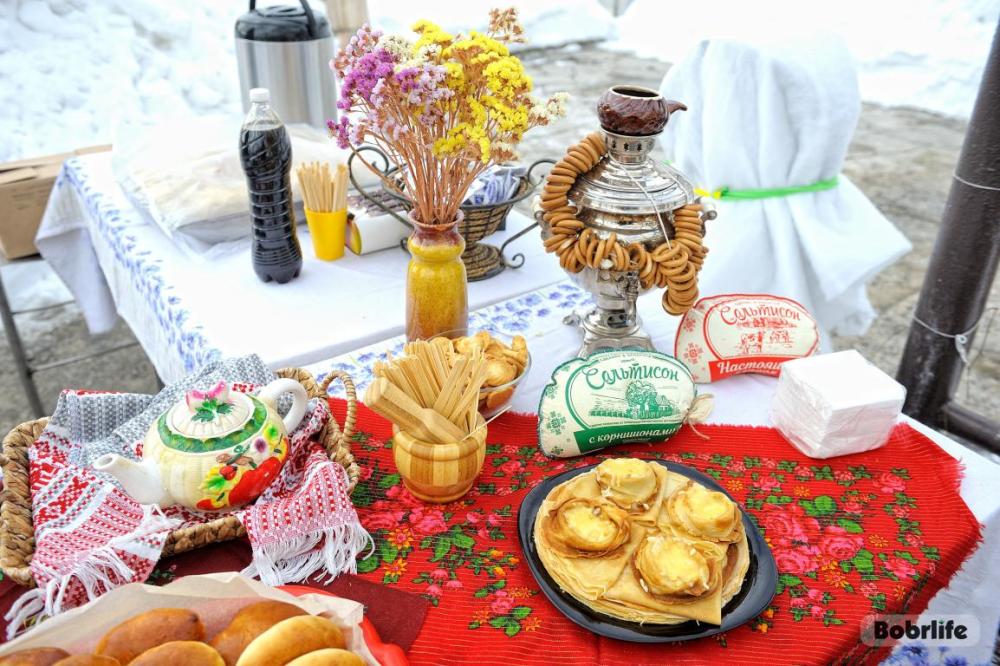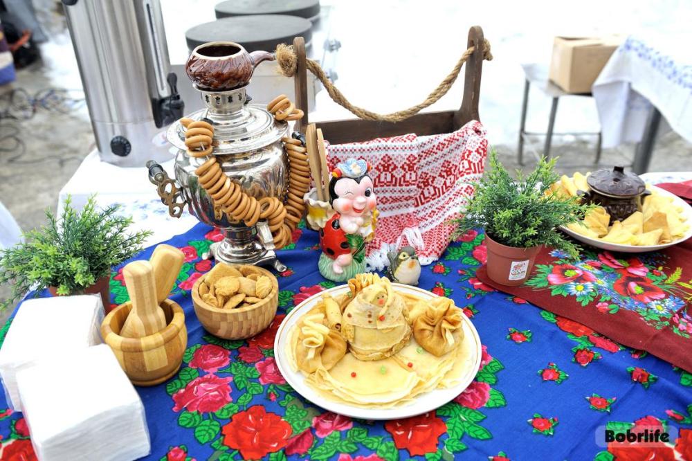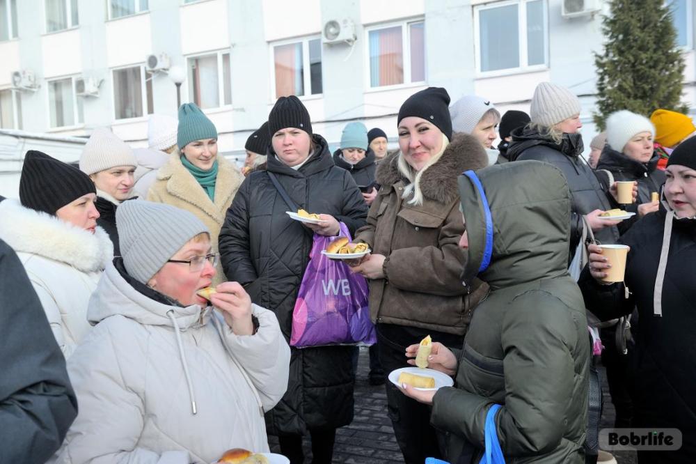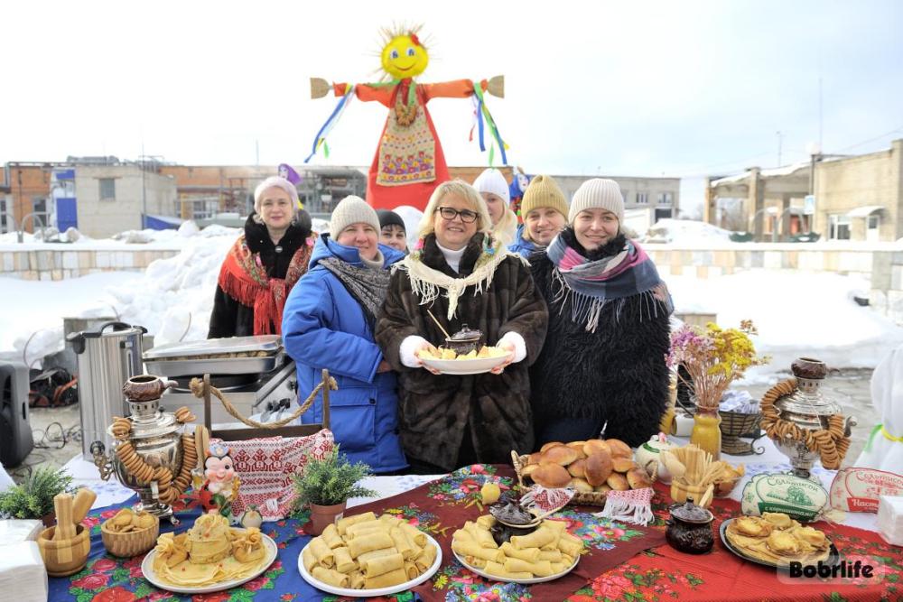 Гостей встречала площадка, украшенная в традиционном народном стиле – с рушниками, лентами и куклами. Внутри нее стояли столы с разнообразными свежими масленичными угощениями, в приготовлении которых использовалась продукция предприятия. Коллектив пригласили попробовать румяные, золотистые блины с ливером, маслом, сметаной, ветчиной и сыром, оладьи с медом, булочки, печенье. К лакомствам подавали горячий чай и согревающий настой из шиповника.