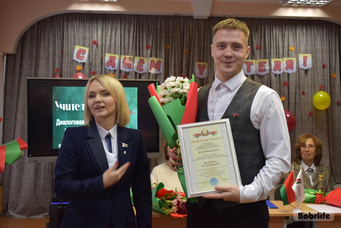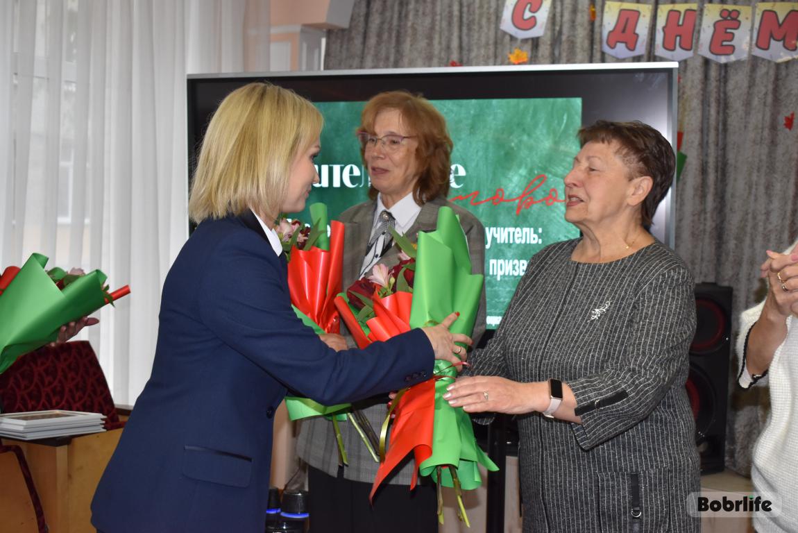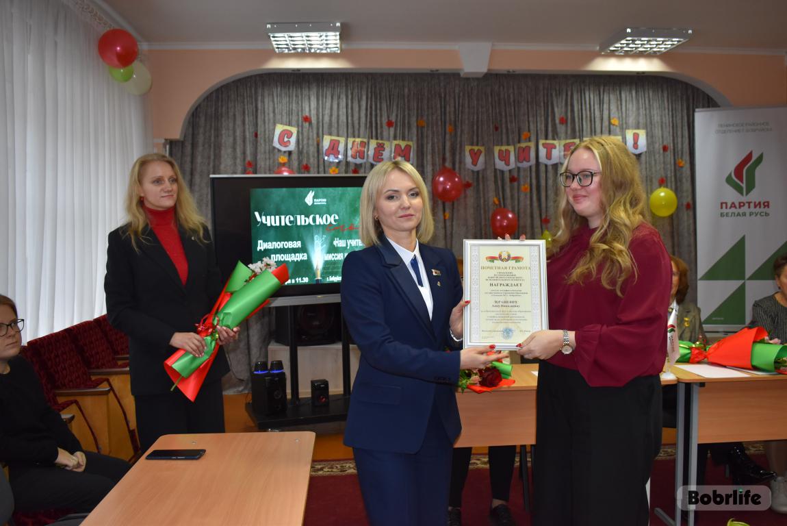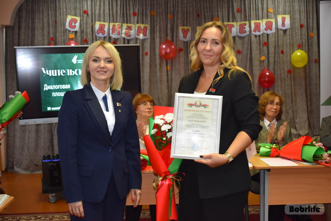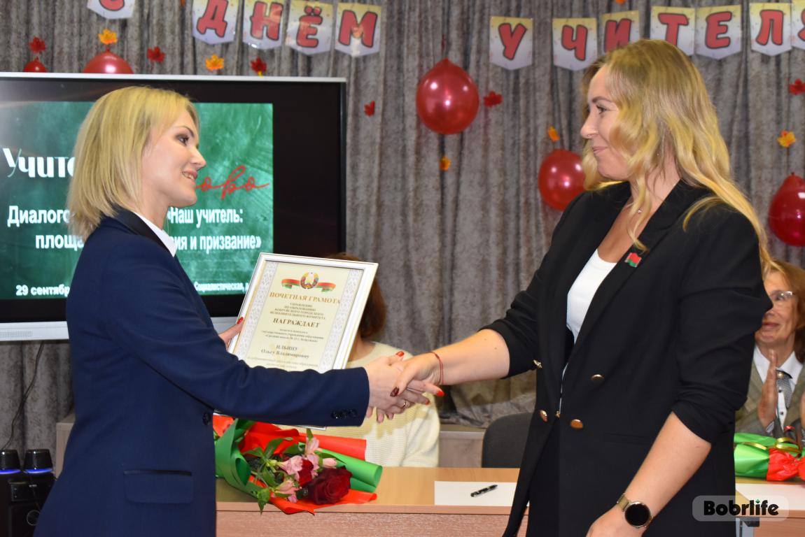 После того как работа диалоговой площадки была завершена и на все вопросы были получены исчерпывающие ответы, Елена Сергеевна провела церемонию награждения наиболее ярких и отличившихся представителей профессии. С особой душевной теплотой и со словами благодарности она вручила букеты цветов ветеранам педагогического труда. Почетными грамотами управления по образованию Бобруйского горисполкома отмечены Ирина Савченко, Илья Вильчук, Ольга Ильина, Анна Юрашкевич.