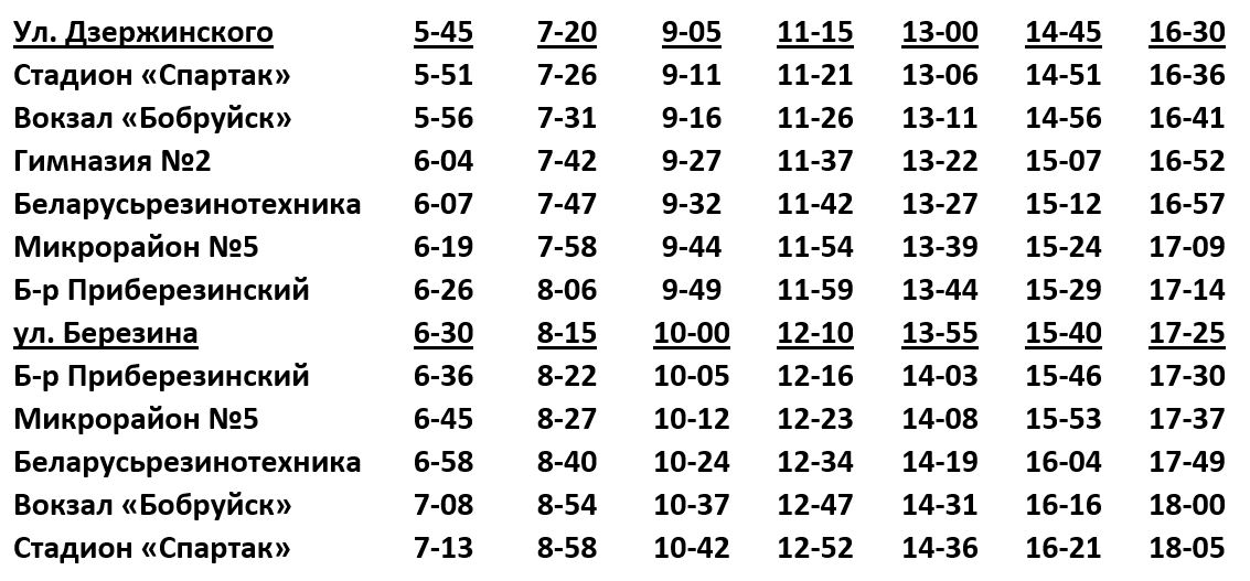ул. Дзержинского, ул. Советская, ул. Интернациональная, ул. Крылова, Георгиевский проспект, ул. Минская, ул. Шинная, проспект Строителей, ул. Сикорского, бульвар Приберезинский, ул. Сикорского, ул. Березина, ул. Сикорского, бульвар Приберезинский, ул. Сикорского, проспект Строителей, ул. Шинная, ул. Минская, ул. Крылова, ул. Интернациональная, ул. Советская, ул. К. Маркса, ул. Пушкина, ул. Дзержинского.