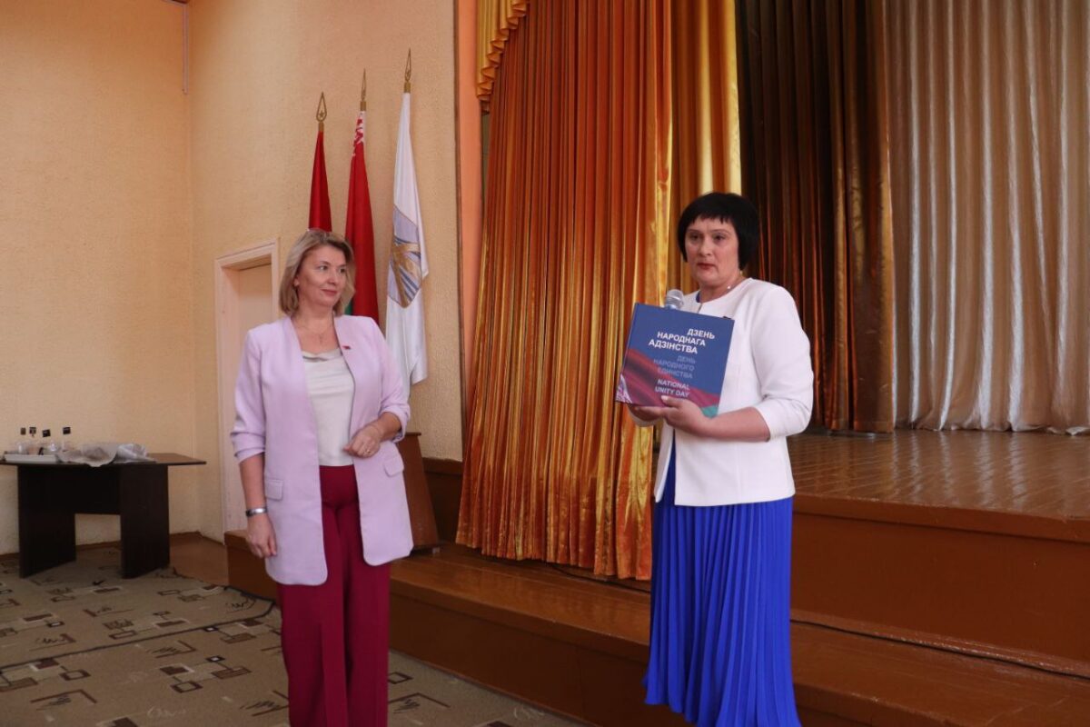 Праздничная программа вместила творческие музыкальные номера, полезную информацию и интерактивы. В начале мероприятия Оксана Приходько обратилась к юному поколению: «Для нас День народного единства – новый молодой праздник, но который корнями уходит в глубокое героическое прошлое. Современная жизнь показала, что сегодняшний мир неоднозначен и нас опять пытались разъединить. Мы стали свидетелями этих событий. Но благодаря тому, что, как и в те далекие времена, были вместе, сплоченной дружной семьей, мы выстояли и в современных испытаниях. Наша с вами задача – сохранить историческую правду и передать будущему поколению. Без прошлого нет великой страны. Наша земля перекраивалась не единожды, но мы нашли силы и мудрость, чтобы белорусами называться. И каким будет наше будущее, зависит от нас. Если мы едины – мы непобедимы!» Оксана Игоревна вручила директору гимназии Анне Шатило книгу «Дзень народнага адзінства», где собраны исторические документы и материалы к этой важной дате.