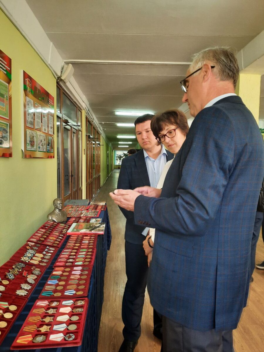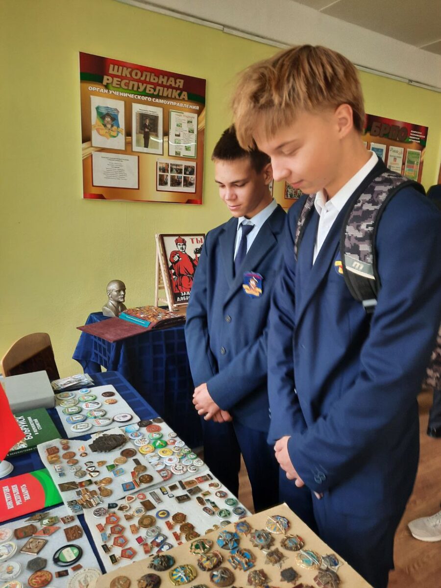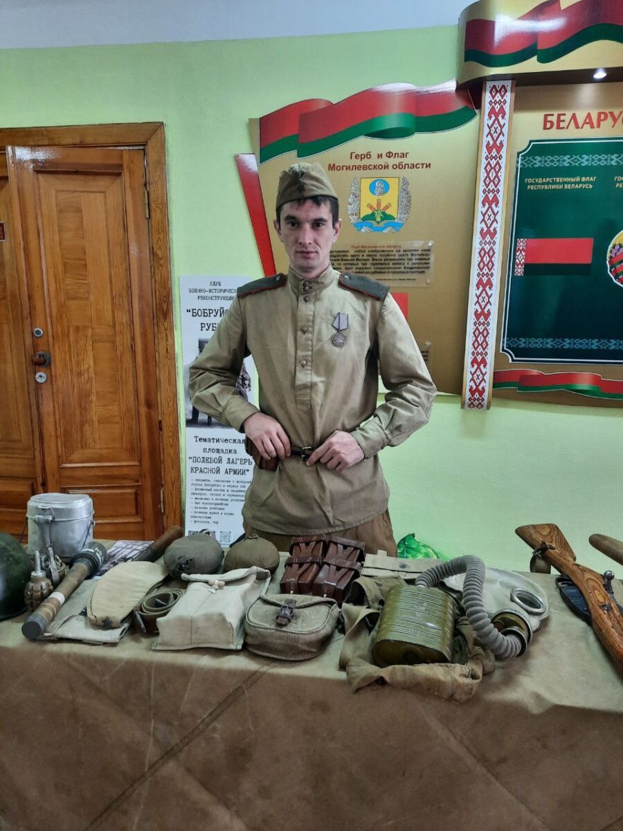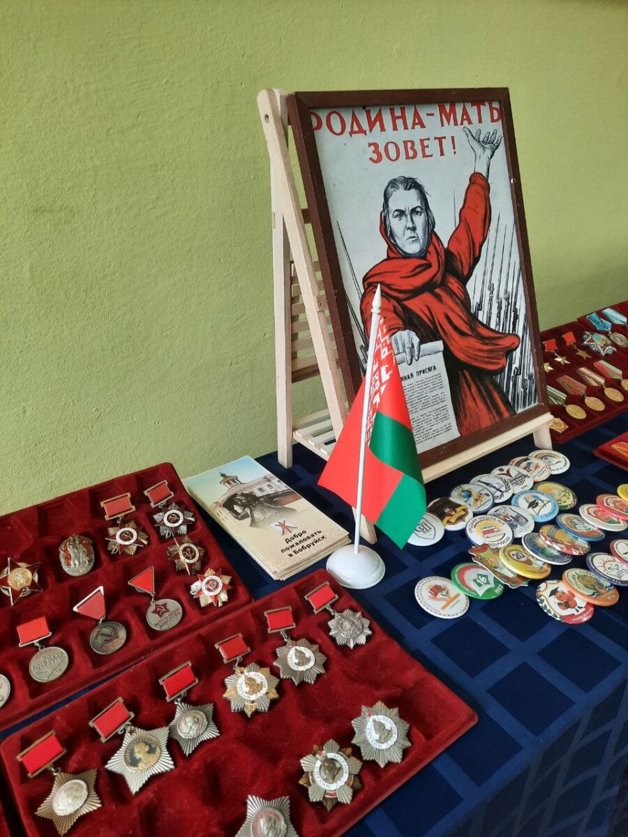 В фойе расположились выставки с экспонатами периода Великой Отечественной войны, Афганской войны и современными экземплярами военного обмундирования, снаряжения и вооружения, представленные клубом «Бобруйский рубеж» и Бобруйским страйкбольным клубом под эгидой ДОСААФ. Ребята с интересом рассматривали значки, медали и ордена военных времен, СССР и современности из коллекции депутата областного Совета Владимира Свиридова. Владимир Вячеславович рассказывал об истории нашей страны, о героях, которые в боях и упорным трудом в мирное время прославляли Беларусь.