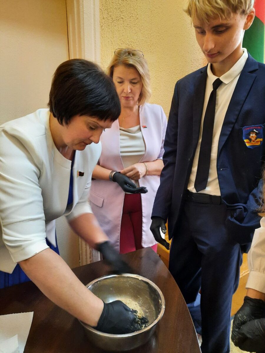 Ведущие напомнили, что слово «единство» – это общность взглядов и сплоченность. И когда речь заходит о сплоченности, в первую очередь всплывают в памяти трагические события Великой Отечественной войны. Минутой молчания почтили всех, кто погиб за Родину, мирное небо и счастливую жизнь. Люди военного лихолетья столкнулись со страшными испытаниями. Ценилась каждая крошка хлеба. Невкусный, пресный, с добавками соломы, древесных опилок, целлюлозы, гнилой картошки, выпекавшийся на соляровом масле… Но без него было не выжить… Участники мероприятия сами попробовали замесить тесто по рецепту военного времени. А рядом можно было увидеть и подержать в руках уже готовые испеченные кусочки хлеба – блокадного, фронтового, тылового, для узников фашистских концлагерей. Учитель обслуживающего труда Анжелика Довнер рассказала, что старые рецепты помогли найти работники Бобруйского филиала «Домочая»: «С девочками мы выпекали 4 вида военного хлеба. Даже через вкусовые ощущения дети поняли, насколько жестокая была та война, как героически выживал наш народ, как тяжела была блокада и как все это страшно. Они настолько прочувствовали и прониклись событиями, что будут всегда по-настоящему ценить мир и трепетно относиться к хлебу».