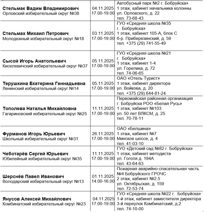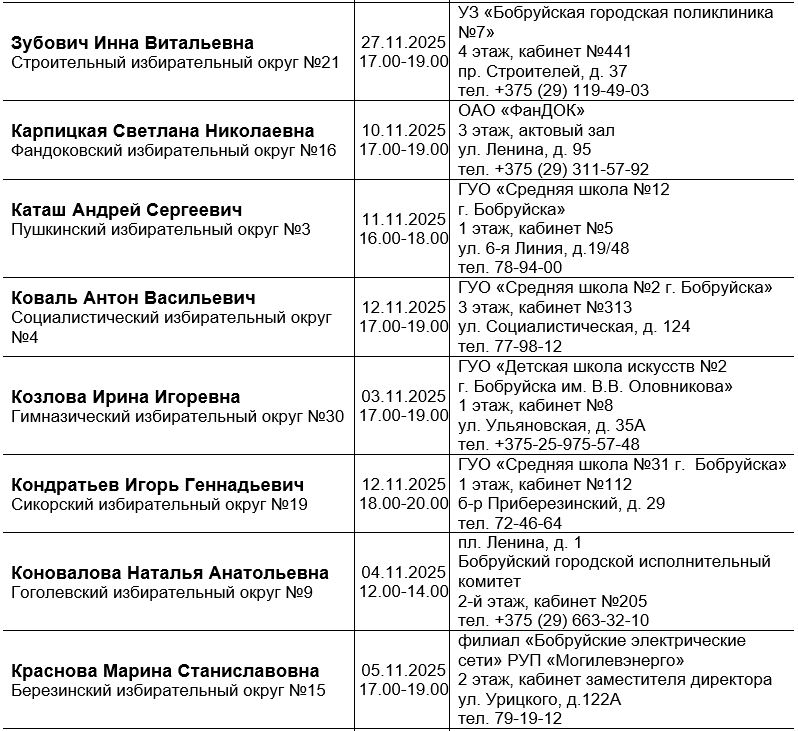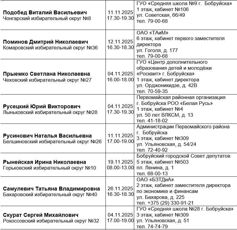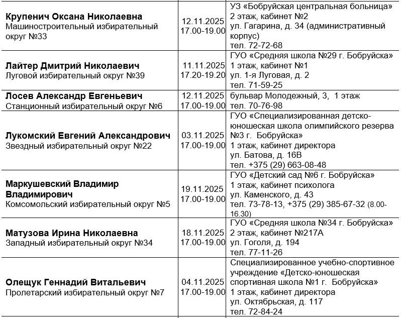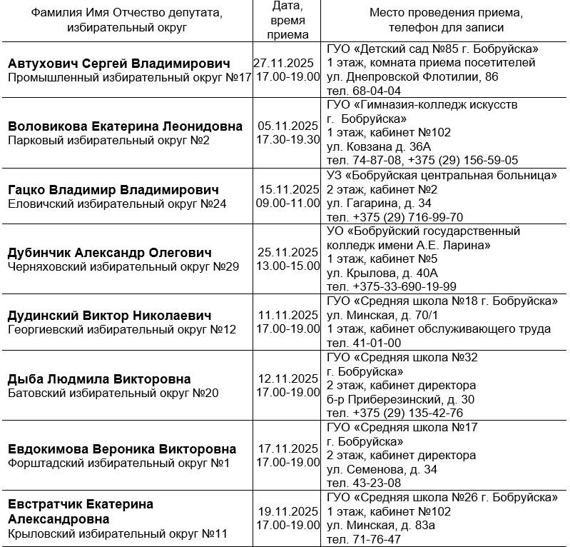 29 октября 2025 График проведения личных приемов граждан и юридических лиц депутатами Бобруйского городского Совета депутатов 29 созыва на ноябрь 2025 года.