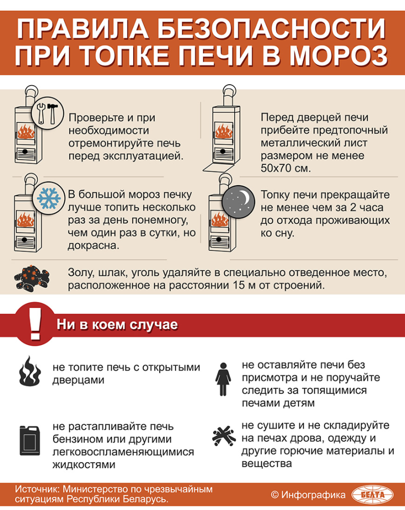 – Не оставляйте без присмотра топящиеся печи и не поручайте надзор за ними детям. Минимум за 2 часа до сна прекращайте топку печи.
