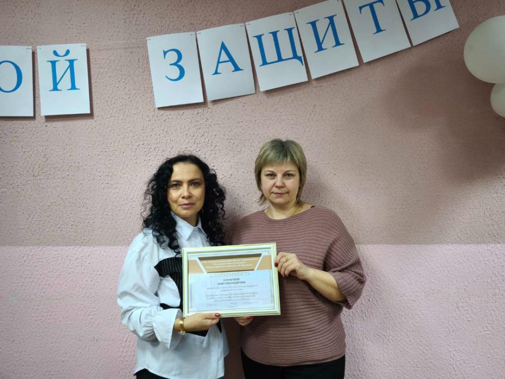 Благодарность директора Центра за добросовестный труд, заинтересованное отношение к работе, в связи с профессиональным праздником – Днем работников социальной защиты была объявлена: Елене Николаевне Вересовой, специалисту по социальной работе Центра, Анне Викторовне Прилищ, психологу Центра, Анне Александровне Сулимовой, заведующему отделением комплексной поддержки в кризисной ситуации Центра, Ксении Сергеевне Ганзюк, заведующему отделением социальной реабилитации, абилитации инвалидов Центра, Марии Николаевне Кашковой, заведующему отделением первичного приема, анализа информирования и прогнозирования Центра, Ольге Александровне Шамаль, заведующему отделением социальной помощи на дому Центра, Елене Ивановне Порсик, специалисту по социальной работе Центра, Светлане Александровне Скучко, специалисту по социальной работе Центра, Виорике Константиновне Мироновой, социальному работнику Центра.