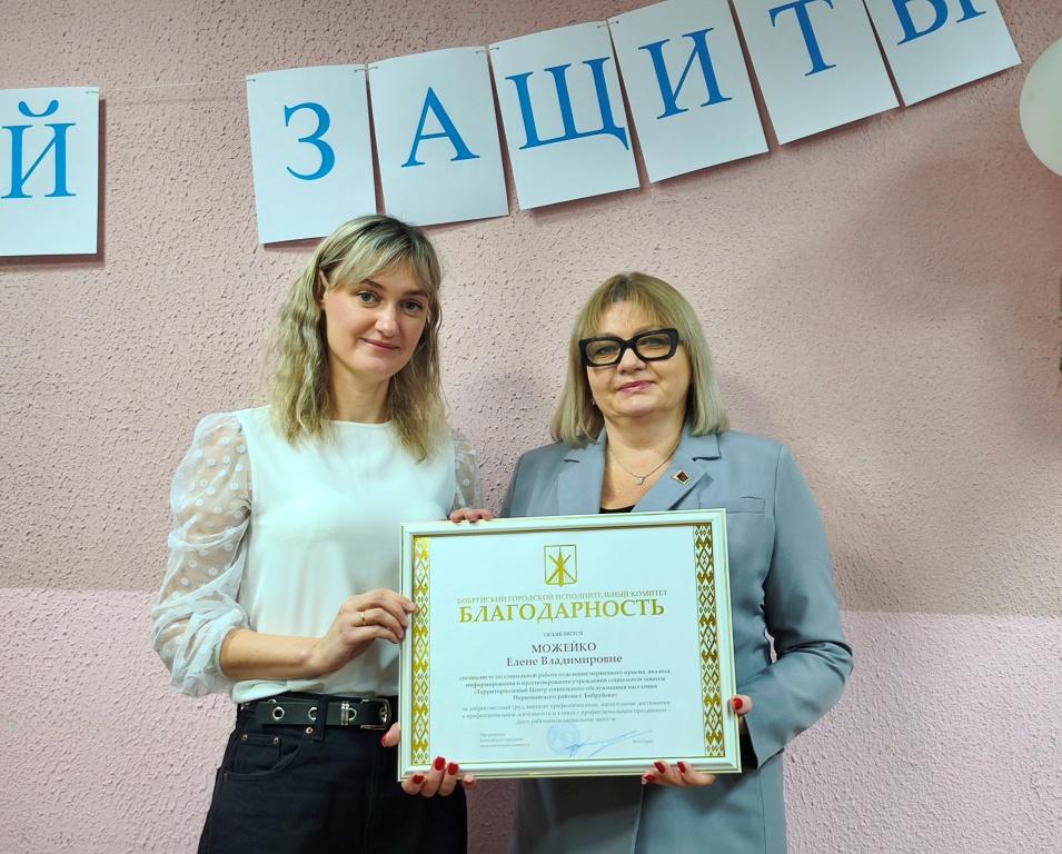 Благодарность Бобруйского городского исполнительного комитета за добросовестный труд, высокий профессионализм, значительные достижения в профессиональной деятельности и в связи с Днем работников социальной защиты была объявлена Елене Владимировне Можейко, специалисту по социальной работе Центра.